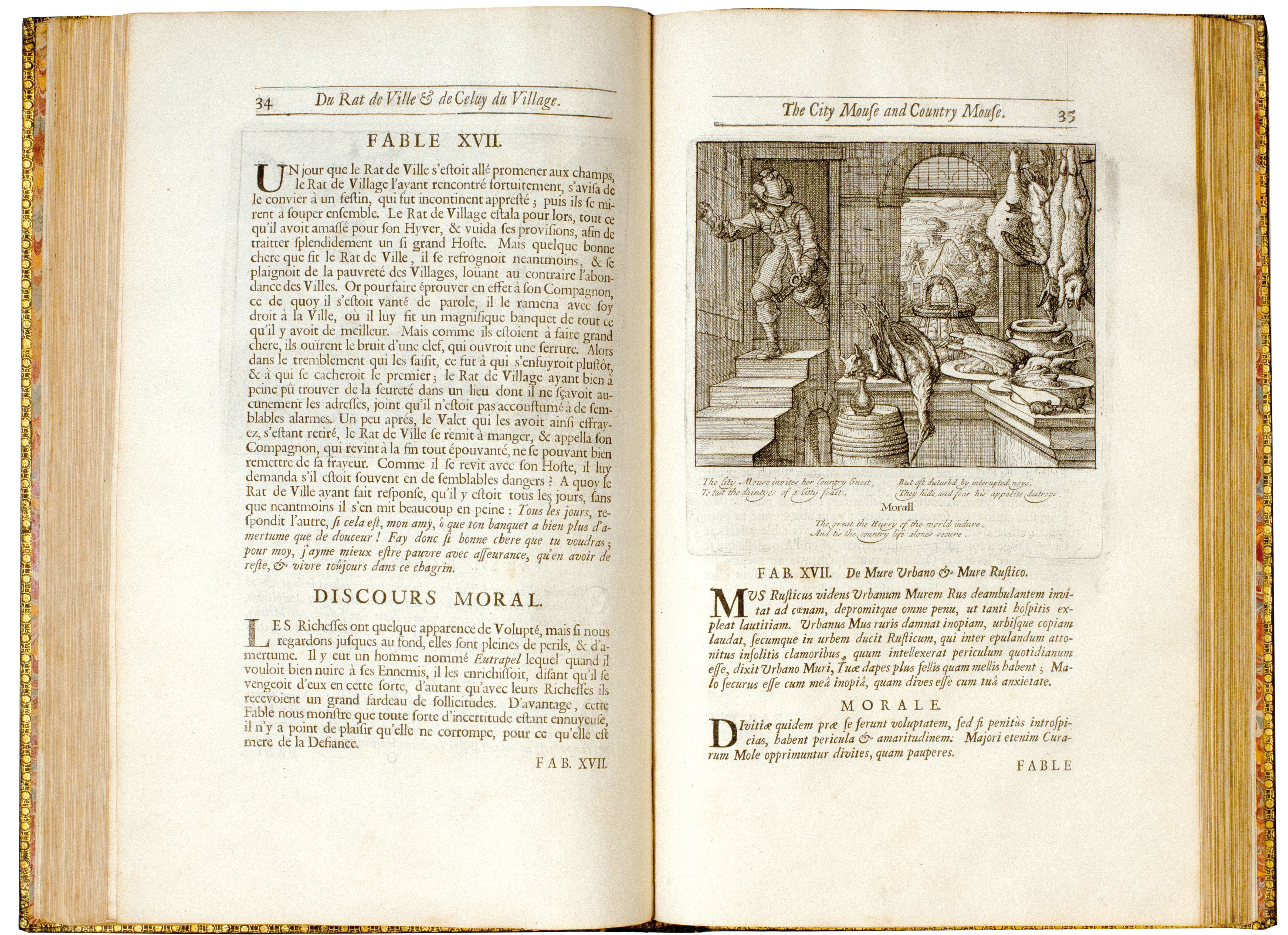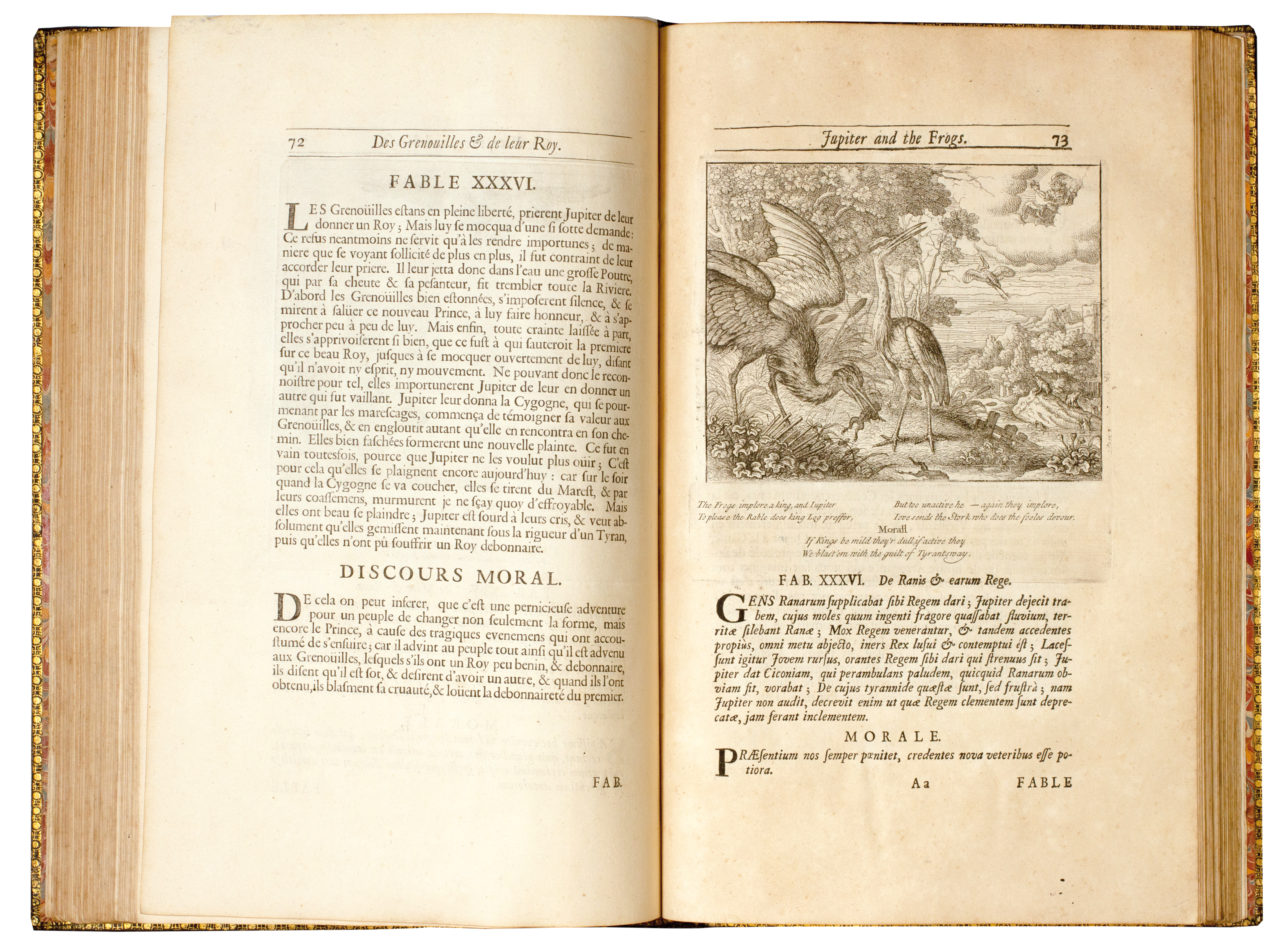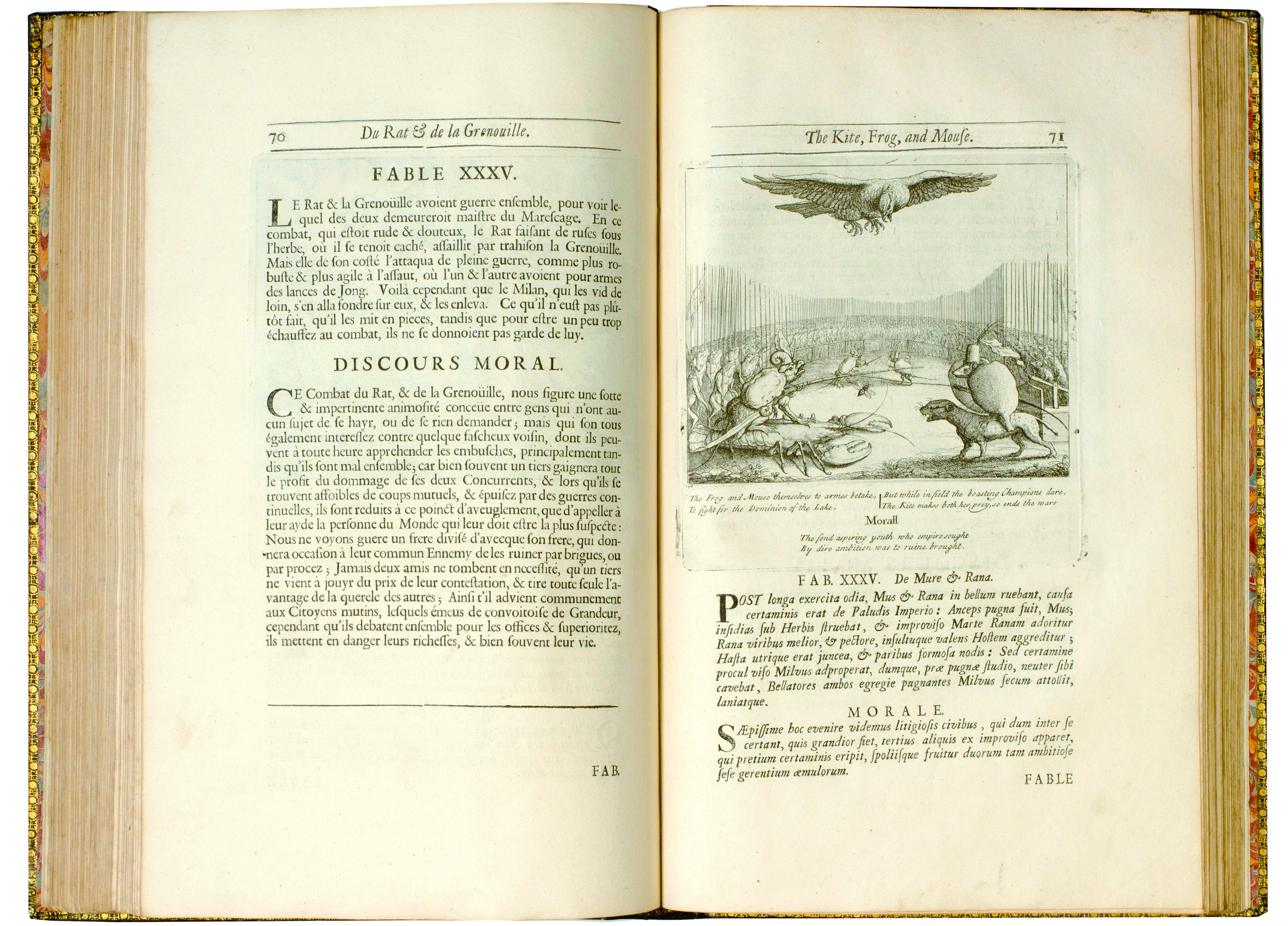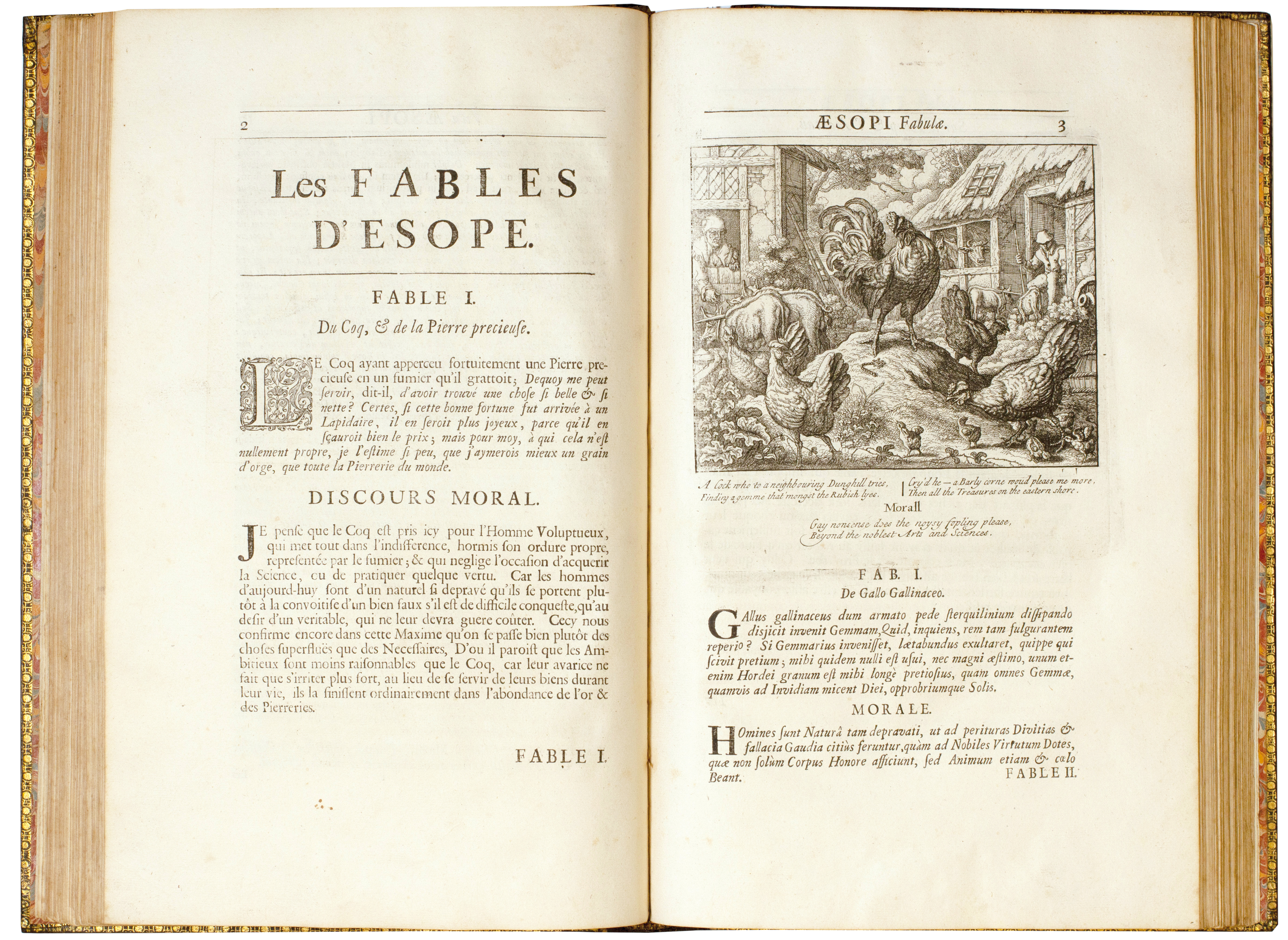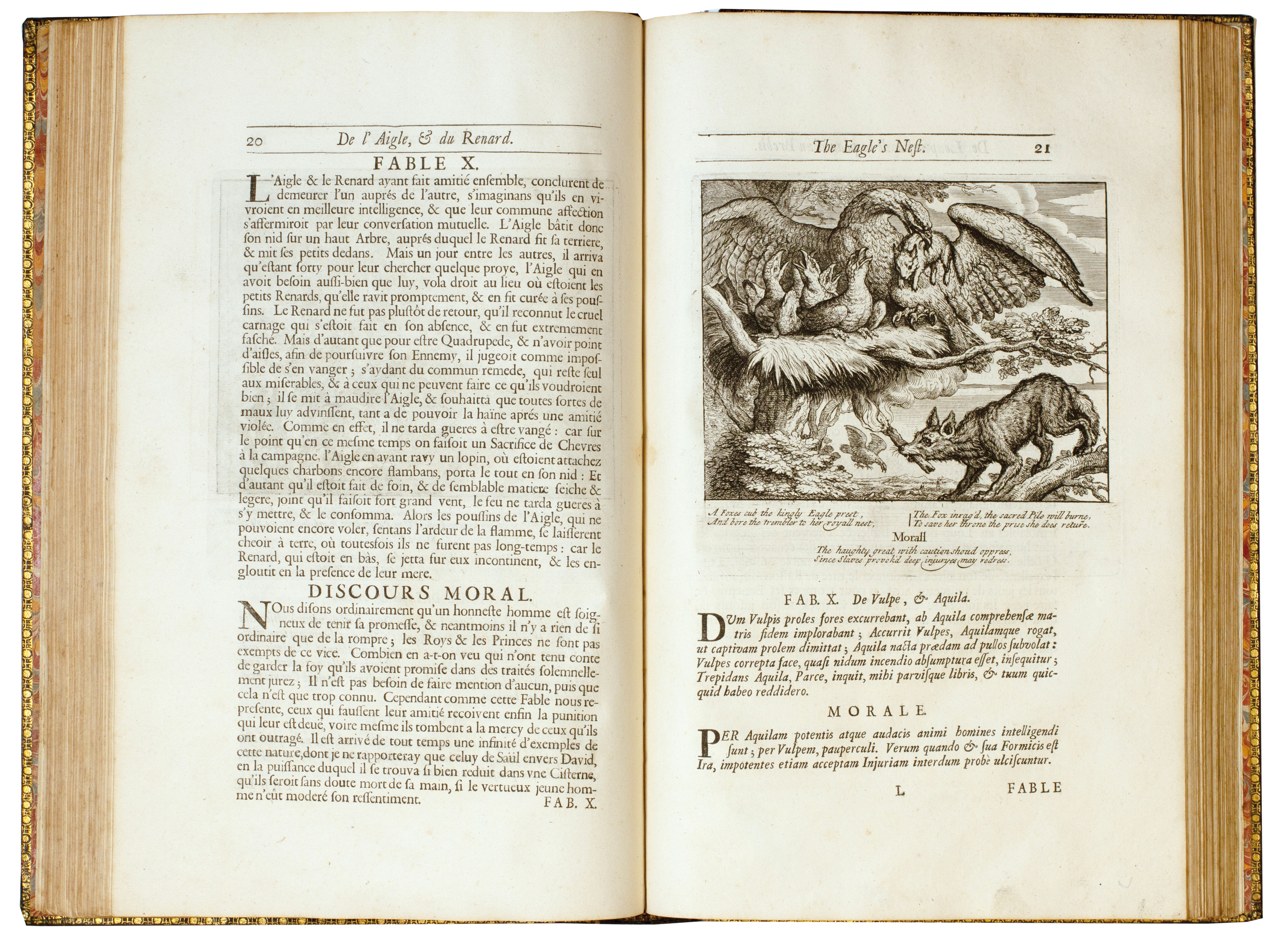 [196 leaves; pp. (x), 40, (62), 40, 17, 2 - 221, (3)]. Collation: a2, B2-I2, K2-L2, B2-I2, K2-L2, B2-I2, K2-T2, V2, X2-Z2, Aa2-Ii2, Kk2-Tt2, Vv2, Xx2-Zz2, Aaa2-Iii2, Kkk2-Ppp2. Contents: Leaf with engraved title verso; title recto, verso blank; leaf with engraved arms of 'William, Earl of Devonshire' verso; a1 dedication leaf 'to the Right Honorable William, Earl of Devonshire'; a2 'to the Reader' recto, engraved frontispiece verso; page 1 (B1) - page 40 (L2) 'A Brief Prospect of the Life of Aesop'; 31 engraved plates by Francis Barlow printed recto only, including the scandalous plate; page 1 (B1) - page 40 (L2) 'la Vie d'Esope, Phrygien'; page 1 (B1) - page 17 (F1 recto) 'Aesopi, Philosophice Fabulantis, Vita'; page 2 (F2 verso) - page 222 (Ppp1 recto 'the Fables of Aesop', 'Fables d'Esope', 'Aesopi Fabulae' with 110 half-page vignette engravings by Francis Barlow with verses by Aphra Behn; Ppp1 verso - Ppp2 recto 'the Table'. Folio. (372 x 242 mm). Engraved title, printed title, engraving with the Devonshire arms, dedication leaf 'to the Right Honourable William of Devonshire', leaf 'to the Reader', engraved frontispiece and 31 engraved plates illustrating the 'Life of Aesop' and 110 half-page vignette engravings to the 'Fables'. Full contemporary midnight blue morocco by the 'Barlow's Aesop Binder', boards ruled in gilt to surround gilt tooled decorative panels with foliate decorative corner pieces, banded spine with elaborate decorative tooling and title 'BARLOWs AESOP' gilt, turn ins and board edges with gilt roll tool decoration, marbled endpapers, a.e.g., black morocco-backed velvet-lined buckram box.