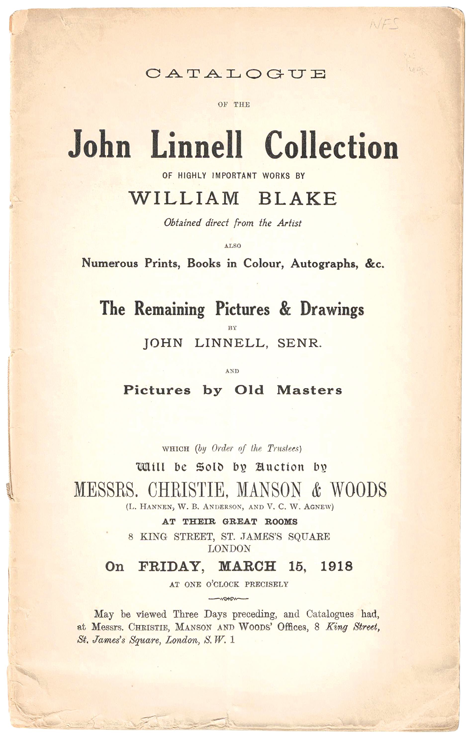 Catalogue of the John Linnell Collection of Highly Important Works by William Blake Obtained Direct from the Artist ... &c