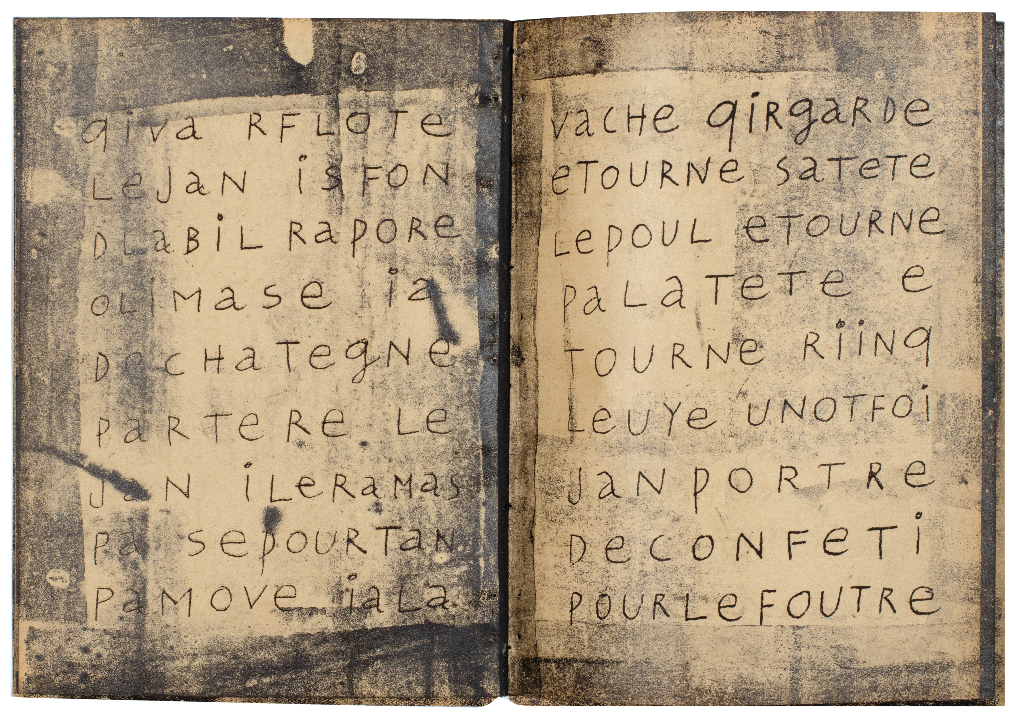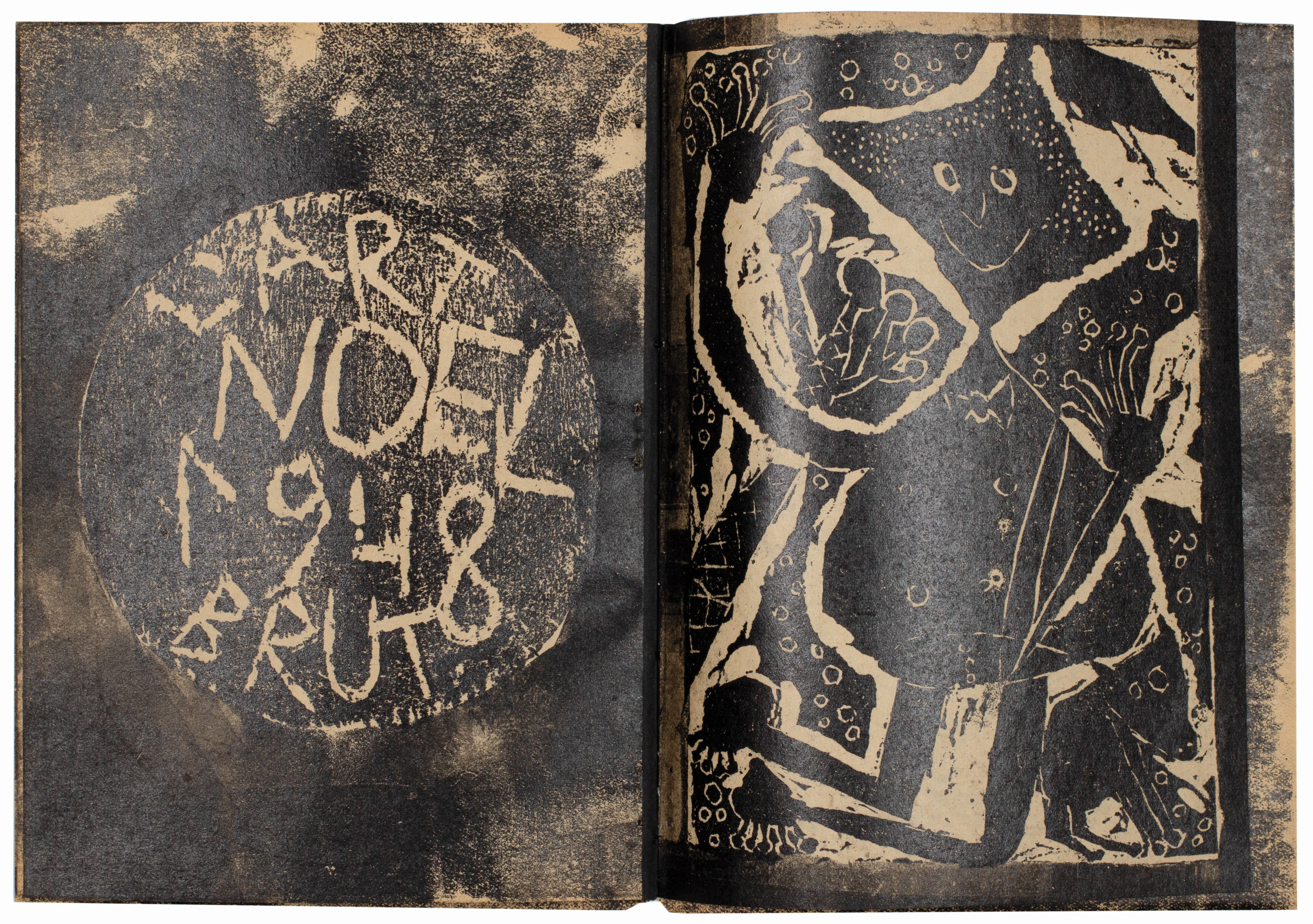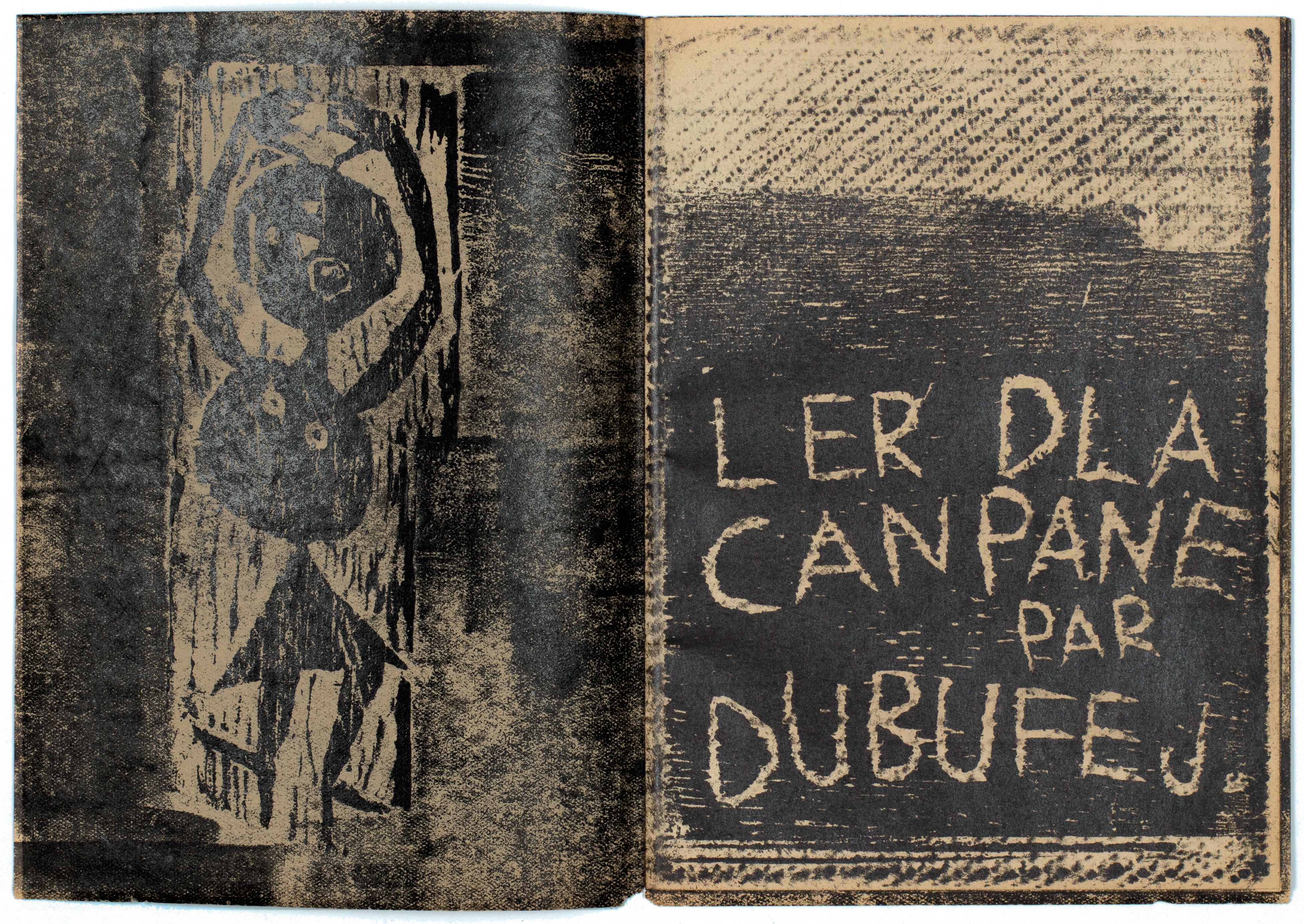 Jean Dubuffet began his book-making oeuvre with three triumphant argotic texts, all with the text reproduced in his own orthography and each written in a specific phonetic French of his own invention - syllabic sounds reproduced with alternative letters and groups of letters, words and sentences elided and unpunctuated - beginning with this, 'LeR DLa CaNpaNe', issued for Noël in 1948. The second of the trilogy, 'anvouaiaje par in ninbesil avec de zimaje', was printed almost exactly a year later and issued in January 1950. The final part, 'labonfam abeber par inbo nom' with illustration of 1949, was issued in spring 1950. These three publications, artist books that amount to anti-livres d'artistes in their conception and production, represent a tour de force of imagination, experiment, mise en page, format and execution.