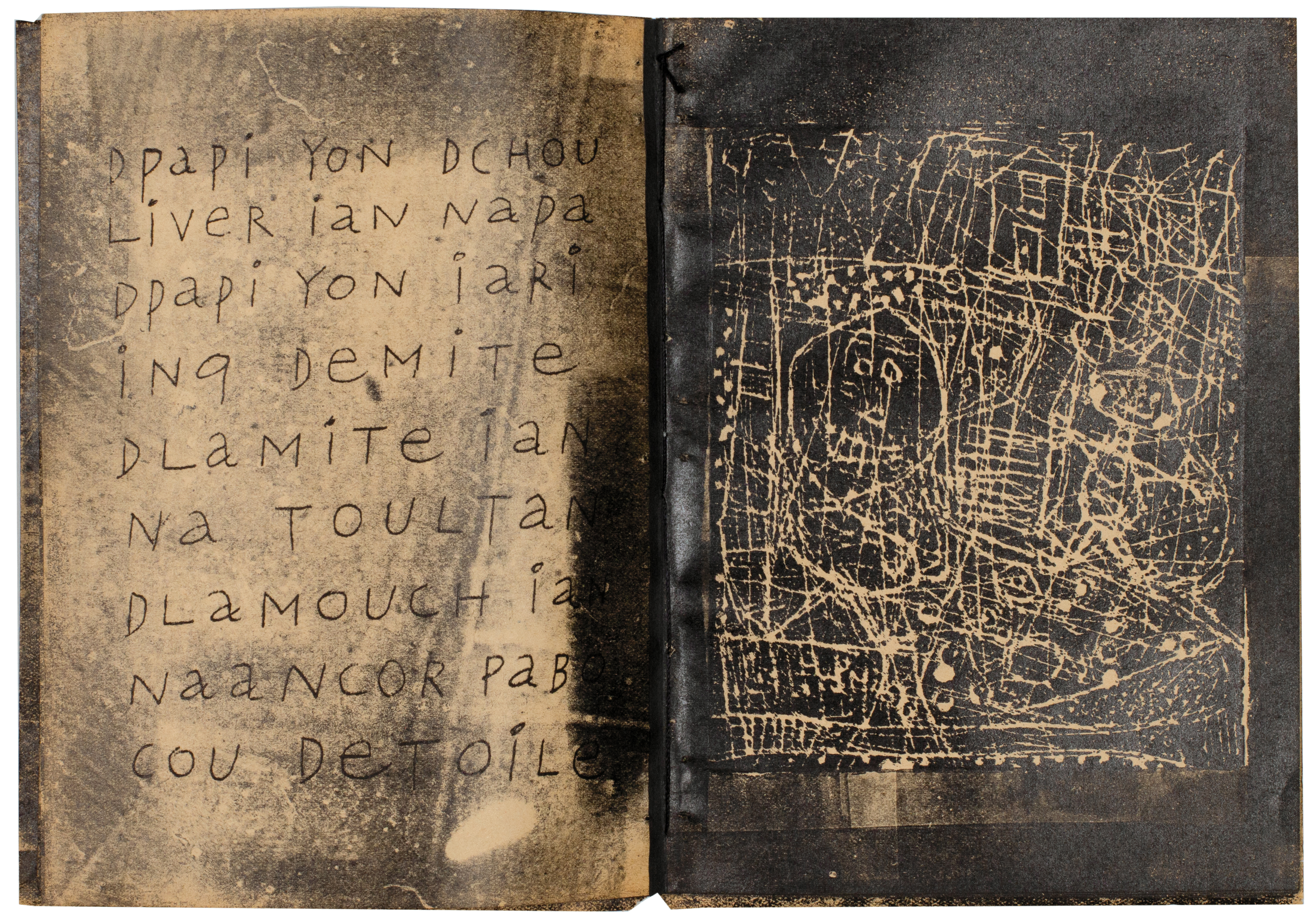 The édition de tête, printed like the normal edition by Dubuffet and his wife by hand, differs greatly from the ordinary edition: it features a title, more leaves, additional illustration, frottage to the text and blanks, as well as an extraordinary patina to each page and the covers themselves produced by overprinting with the rouleau encreur. Each copy of this highly restricted tirage is necessarily unique as each was prepared and 'maculé' by Dubuffet by hand with the result that there is extensive variation in the inking and printing especially to the blank leaves and margins; in this example the order of the text and plates differs to that of Webel and pages and 8 and 9 (with the lithograph 'Paysage Champêtre avec Deux Personnes' and the page of text beginning 'DTERE PARTOU') are transposed.