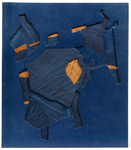 [5 unnumbered leaves including inserted leaf with Frénaud\''s presentation]. Square 8vo. (202 x 176 mm). Front wrapper / initial leaf with title, inserted blank leaf with elaborate presentation by Frénaud in red ink recto and verso, leaf with monochrome lithograph illustration ('Vache no. 4') with lithograph dedication: 'à André / Frénaud / amitié / J. Dubuffet / 9 Nov 44'), leaf with Frénaud's text 'à Jean Dubuffet' recto and verso, final leaf (rear wrapper) with conclusion of Frénaud's text recto and achevé d'imprimer and justification verso. Full blue limp crushed morocco by Monique Mathieu with her signature gilt and dated 1976, front cover with elaborate asymmetric excisions, inserted sections of asymmetric tan suede and blue toned calf to form an abstract geometric motif recalling a cow, morocco doublures and endleaves, original printed printed Auvergne wrappers with title to front cover and justification and achevé d'imprimer to rear wrapper preserved, chocolate reverse calf-lined blue cloth chemise with gilt title to spine and blue cloth slipcase.