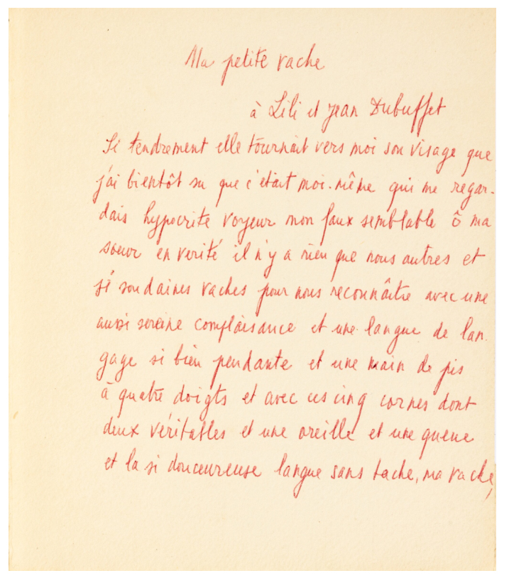 Frénaud's extensive manuscript, the prose poem 'Ma petite vache', is in red ink to an inserted leaf recto and verso: 'Ma petite vache / à Lili et Jean Dubuffet / Si tendrement elle tournait vers moi son visage que / j'ai bientôt su que c'était moi-même qui me regar- / dais hypocrite voyeur mon faux semblable ô ma / sœur en vérité il n'y a rien que nous autres et / si soudaines vaches pour nous reconnaître avec une / aussi sereine complaisance et une langue de lan- / gage si bien pendante et une main de pis / à quatre doigts et avec ces cinq cornes dont / deux véritables et une oreille et une queue / et la si doucereuse langue sans tache, ma vache, / et elle portait sa bouse en tache fière sur son / justaucorps comme un blason, et Dubuffet / lui avait fait encore un soupçon d'universelle / géographie sur toute sa quadrature et des yeux / fastes pas cynique crénelés si affectueux, le / Dubuffet qui le 9 novembre 1944 m'a bien / affectionné, moi aussi, et d'ailleurs vous en êtes / une autre Monsieur Dubuffet et nous en ferons / encore des vaches et nos pis ne se dégonfleront / pas du tout à la vôtre / 31-1-45 / André Frénaud'.
