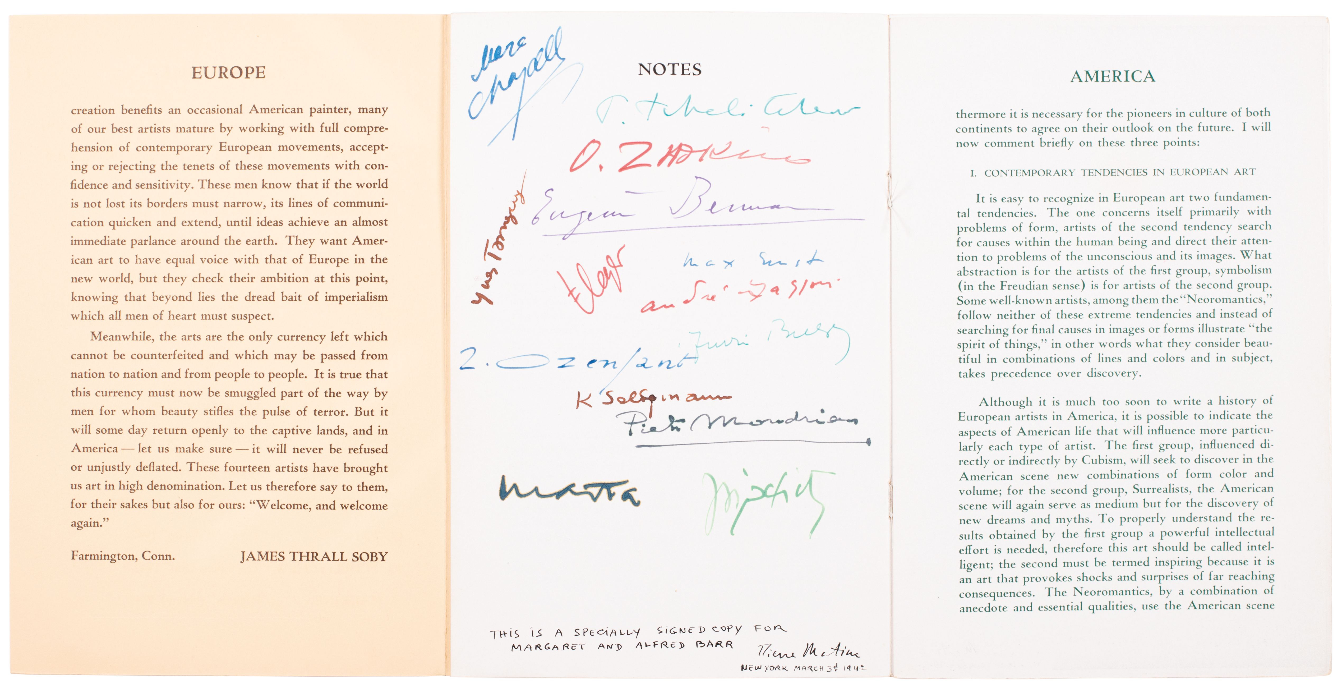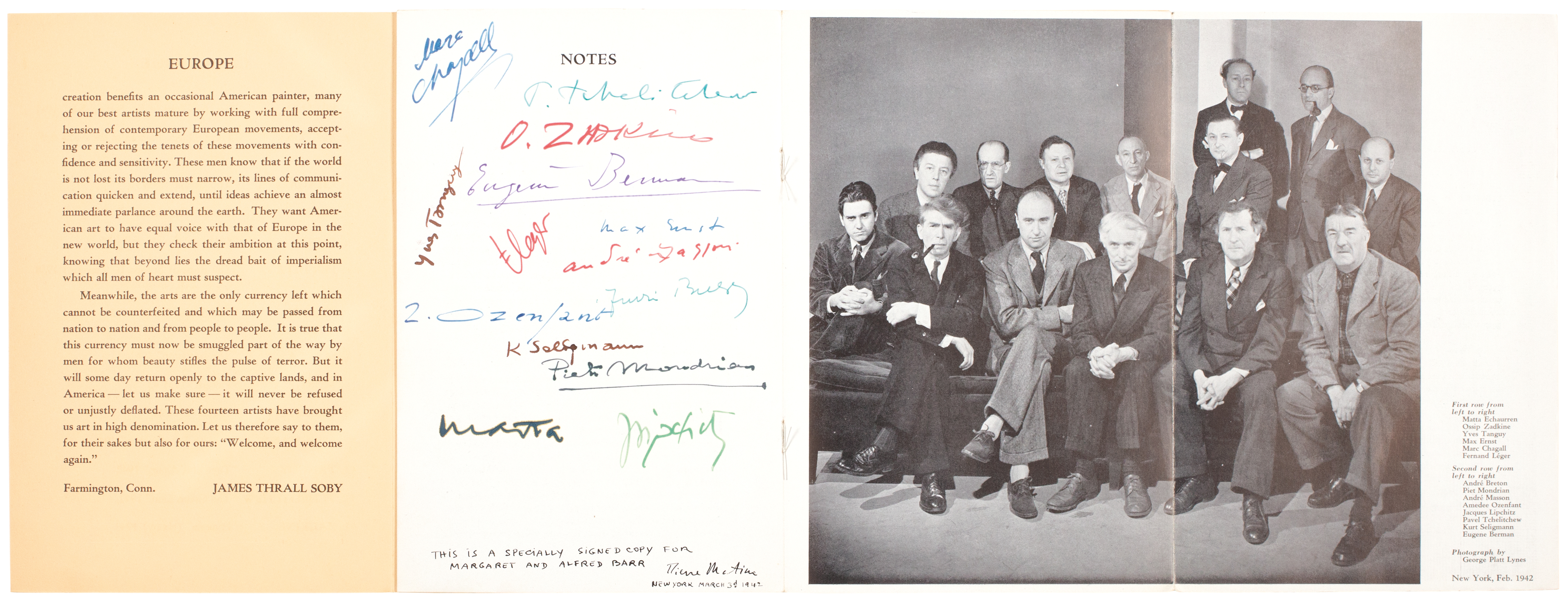 Margaret and Alfred Barr's presentation copy of the catalogue for the exhibition they had done so much to enable, signed by all of the participating artists and by the gallerist Pierre Matisse.
