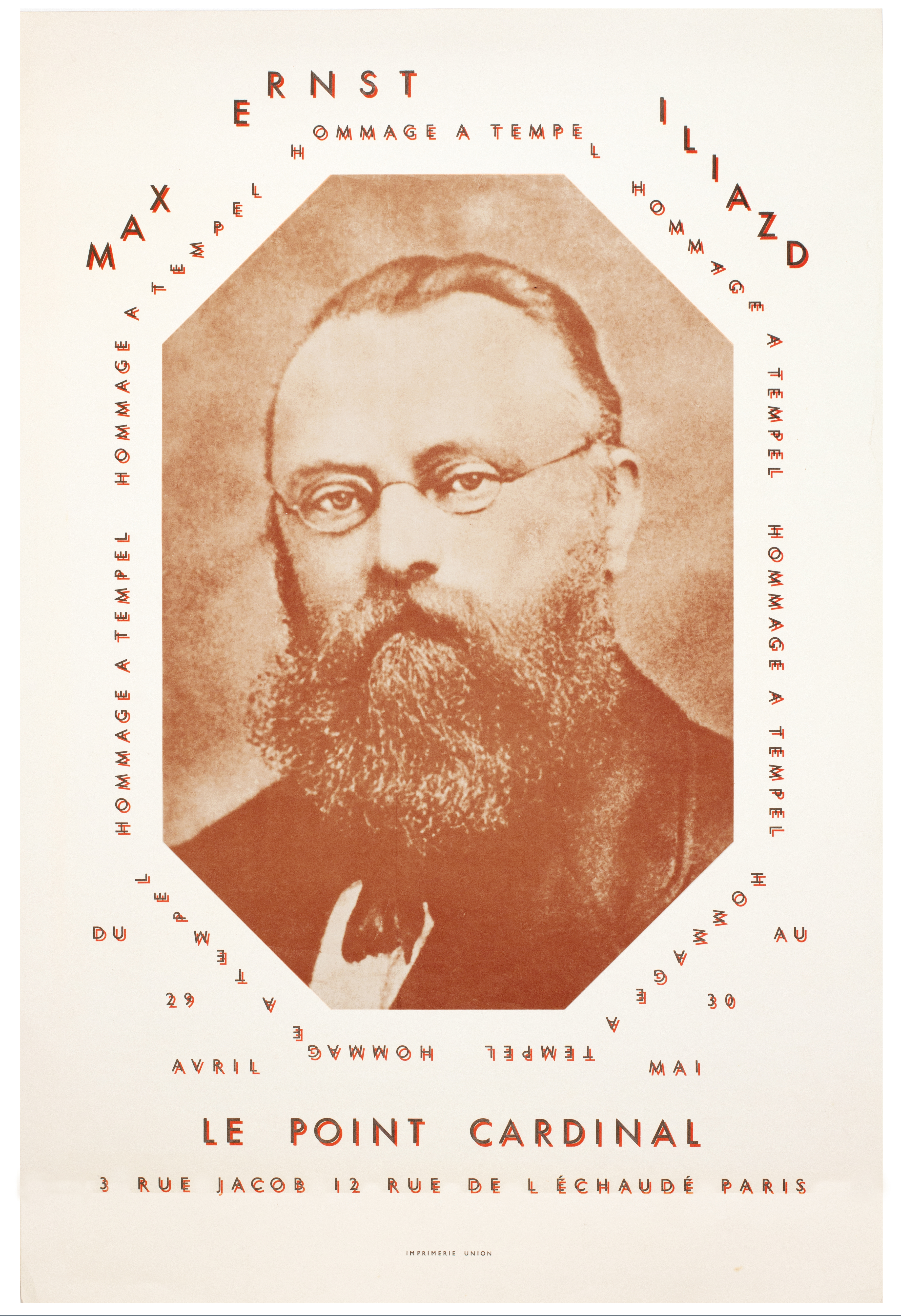 Held at 'Le Point Cardinal' in rue Jacob, Paris, from 29th April to May 30th, 1964, the exhibition of the 'bonnes feuilles' of Maximiliana was heralded with this poster. Although the poster omits the name of Iliazd and Max Ernst's collaboration, i.e. '(65) Maximiliana ou l'Exercise Illégal de l'Astronomie', the poster does make clear their enormous admiration for and indebtedness to Tempel.