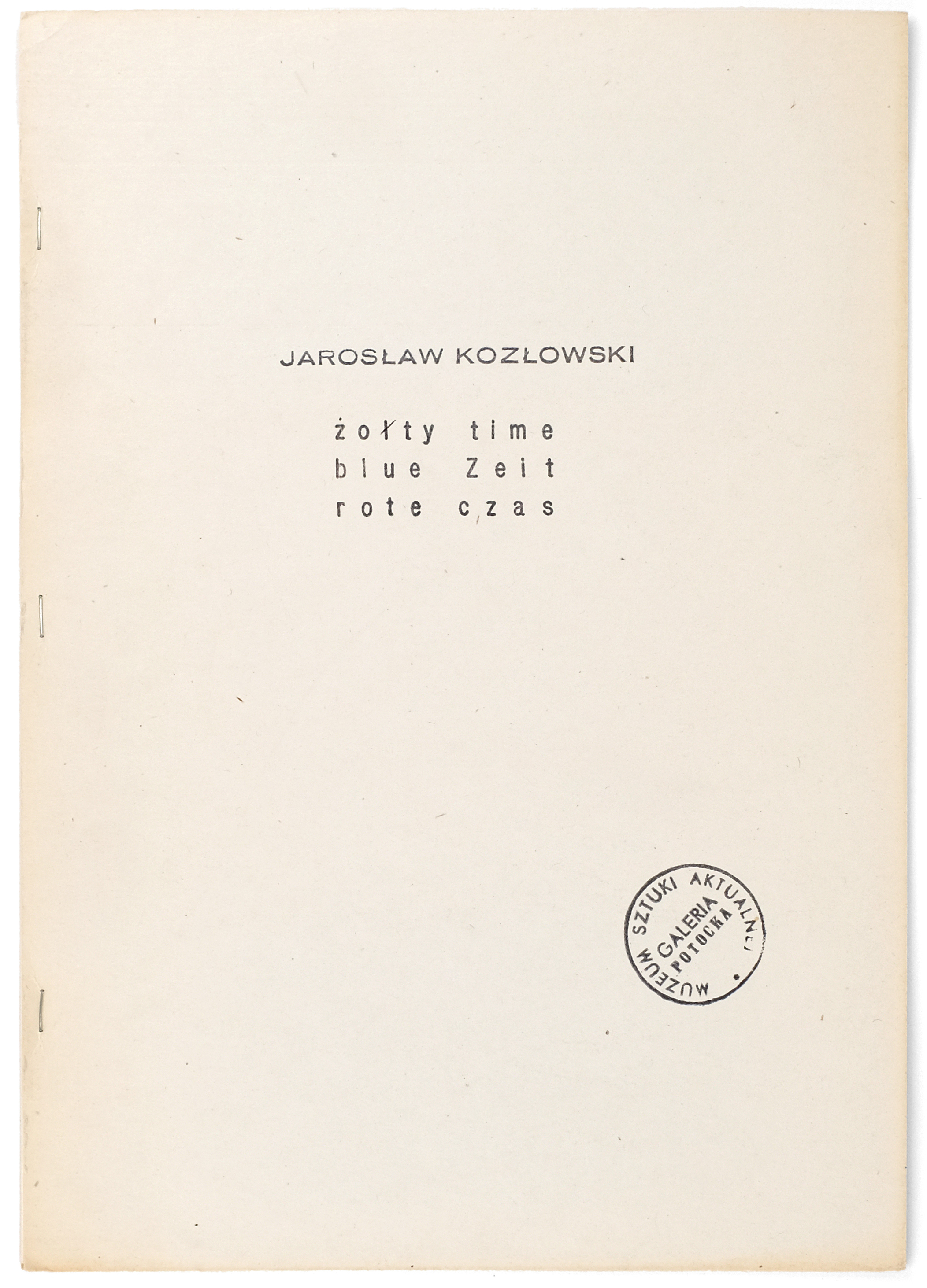This bookwork presents a clever conceit on the artificiality of time. The trilingual title translates as 'yellow (zolty) / time / blue / time (Zeit) / red (rote) / time (czas'). The final page contains the text 'What time is it? It's five seconds of yellow', also translated into German and Polish.