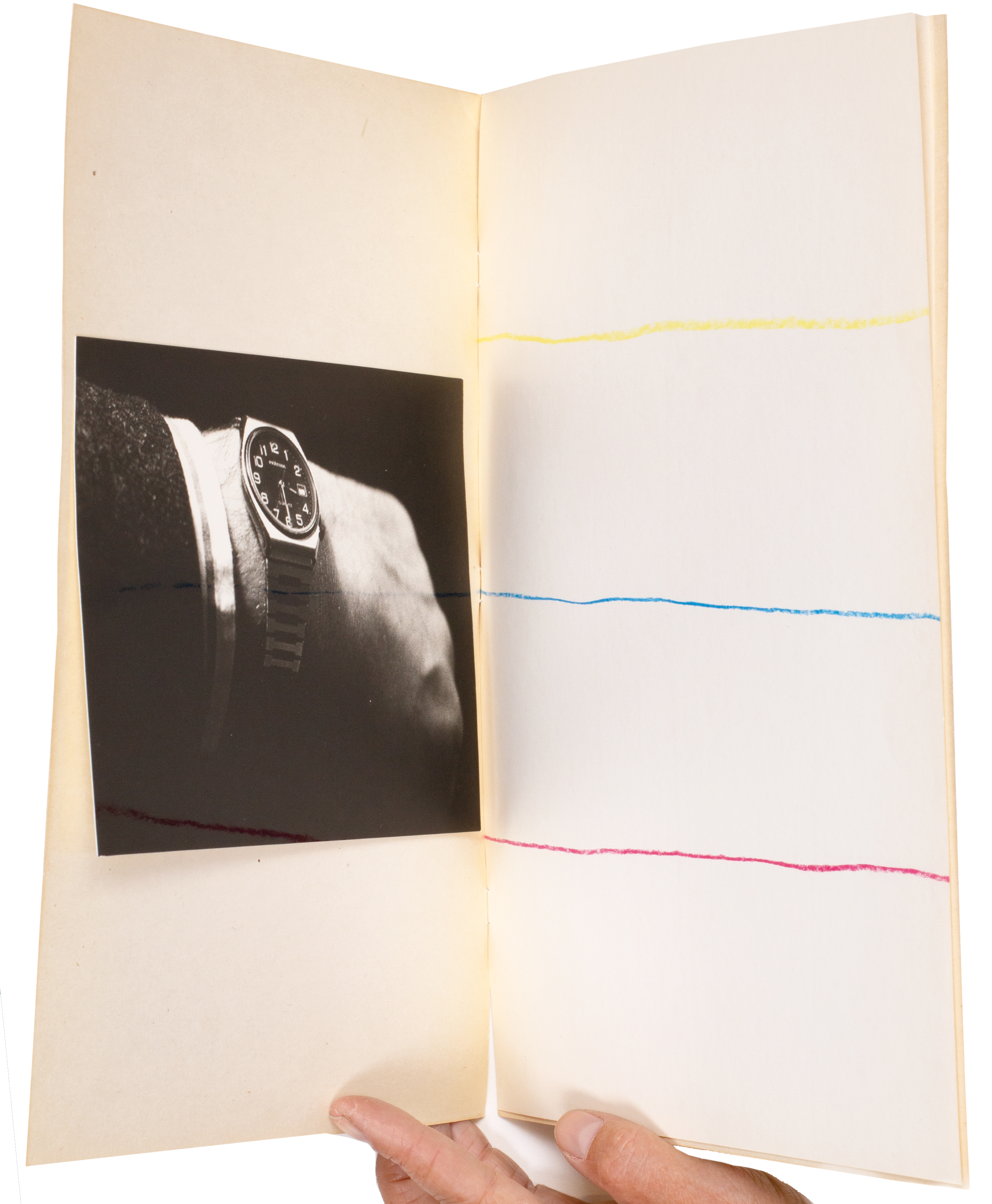 [2 leaves; pp. (4)]. 4to. (297 x 210 mm). Original monochrome photograph of a wristwatch pasted to front cover verso; first leaf with original crayon drawing of three horizontal lines in yellow, blue and (pinkish) red. Original publisher's white printed card wrappers, stapled as issued, titles to front cover in black.