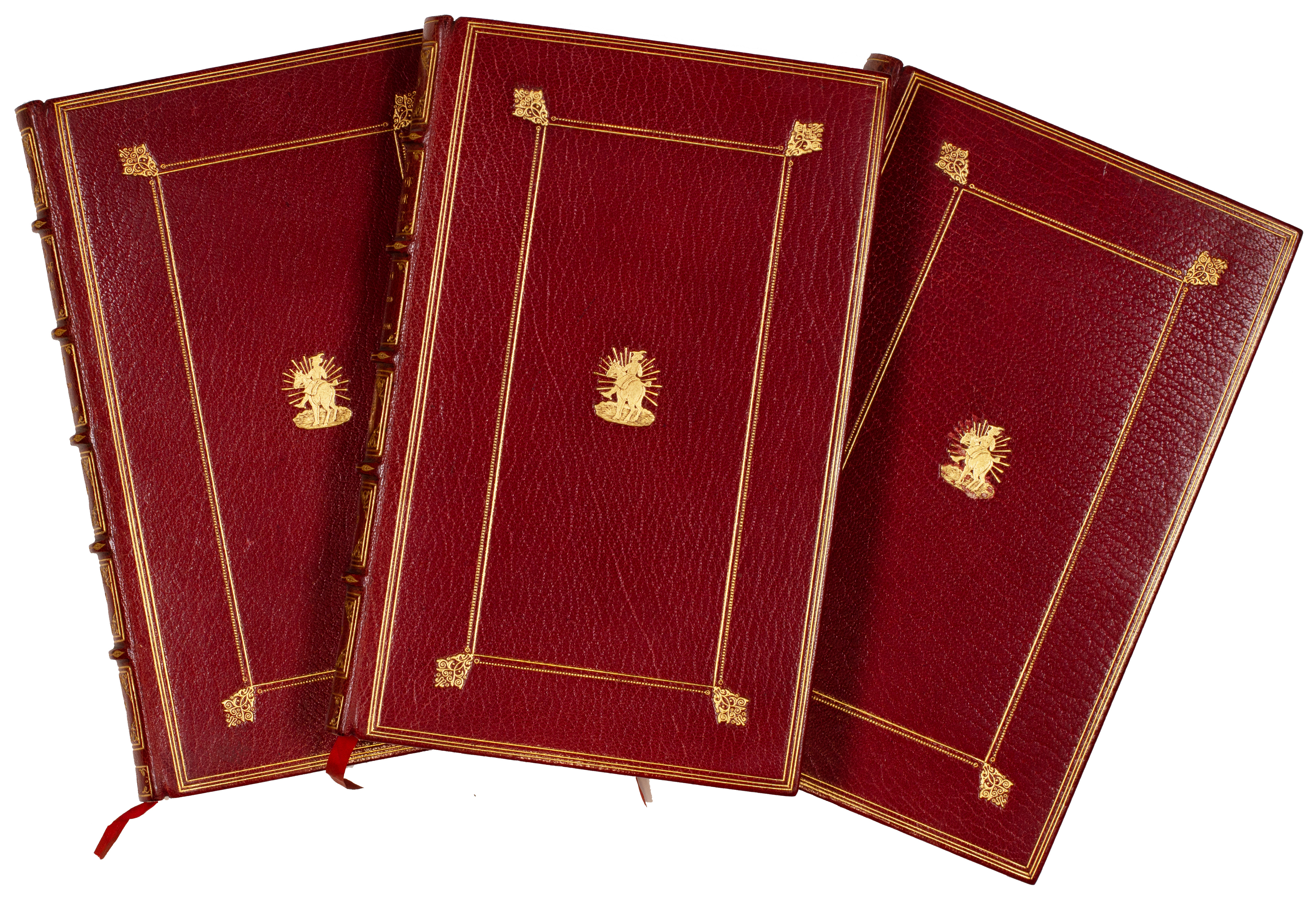pp. 276; 277; 279. 3 vols. 8vo. (230 x 152 mm). Vol. I: engraved title with aquatint vignette, and 30 aquatint plates including frontispiece, title and plates ; vol. II: engraved title with aquatint vignette with 24 aquatint plates including frontispiece; vol. III: engraved title with aquatint vignette and 24 aquatint plates, vignette and plates. Plates coloured throughout by a contemporary hand. Later red morocco by Root, boards ruled in gilt and with central gilt vignette tool of a man riding an ass, banded spines with gilt titles and tooling in six compartments, turn-ins tool;ed in gilt, red silk doublures and endpapers, t.e.g.