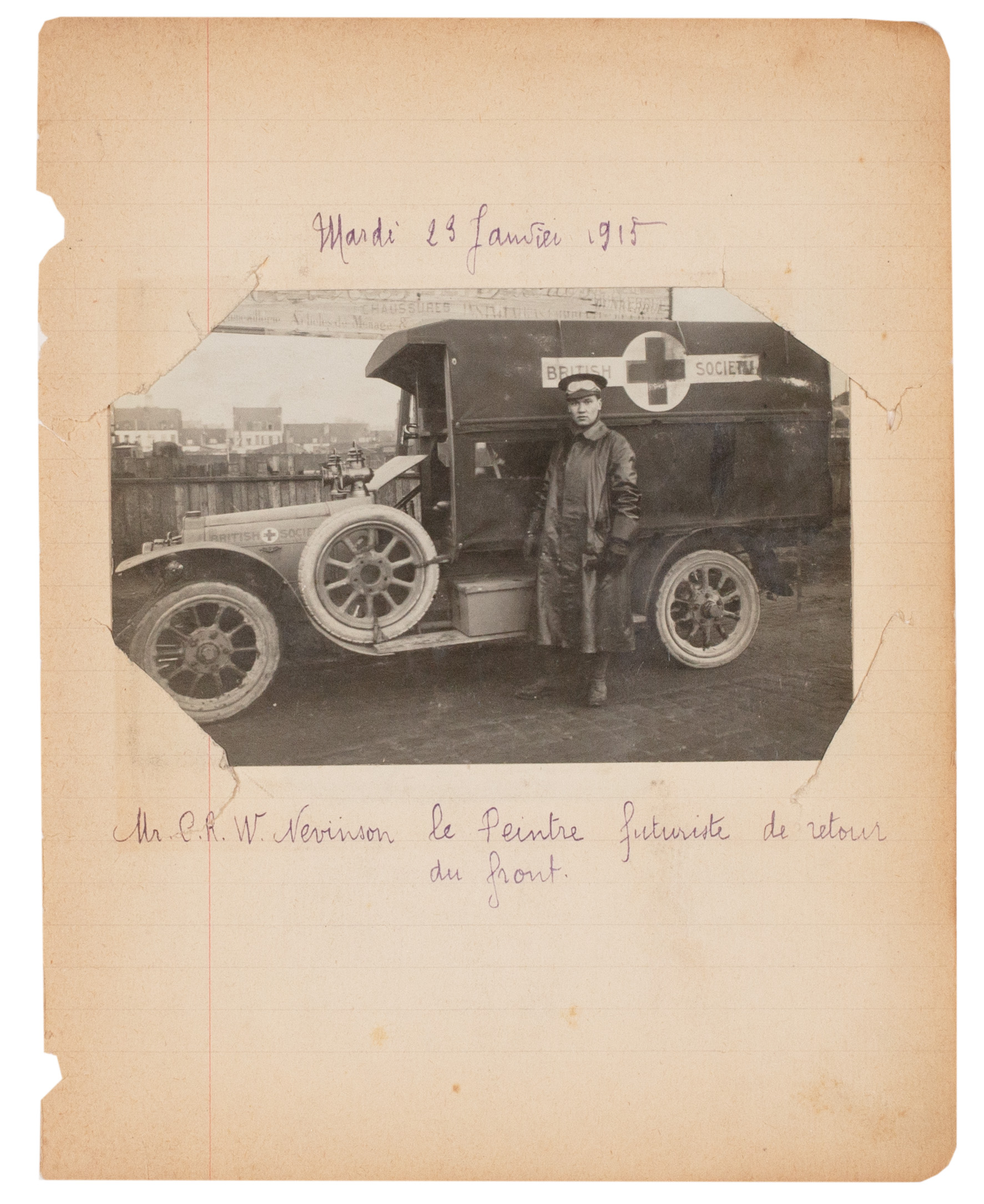 The recipient of the present drawing and photograph was Sister Simone Lengrand, a nurse at the Lady Florence Fiennes Hospital (the dearth of adequate medical facilities in the early part of the war saw the establishment of private hospitals funded by philanthropic individuals or societies), who must have known Nevinson through their work at the hospital. Nevinson commissioned this photograph, of the artist beside his 'bus', a Mors Motor ambulance, and sent another example to Marinetti, now held at the Palazzo Grassi. Although the reasons for Nevinson's departure from France are unknown - Nevinson suggests he was invalided home - he was certainly back in London very shortly after this drawing was executed and presented. Nevinson exhibited compositions inspired directly by his experiences in March 1915 before he volunteered for service with the Royal Army Medical Corps in London; he was commissioned as an official war artist in 1917.