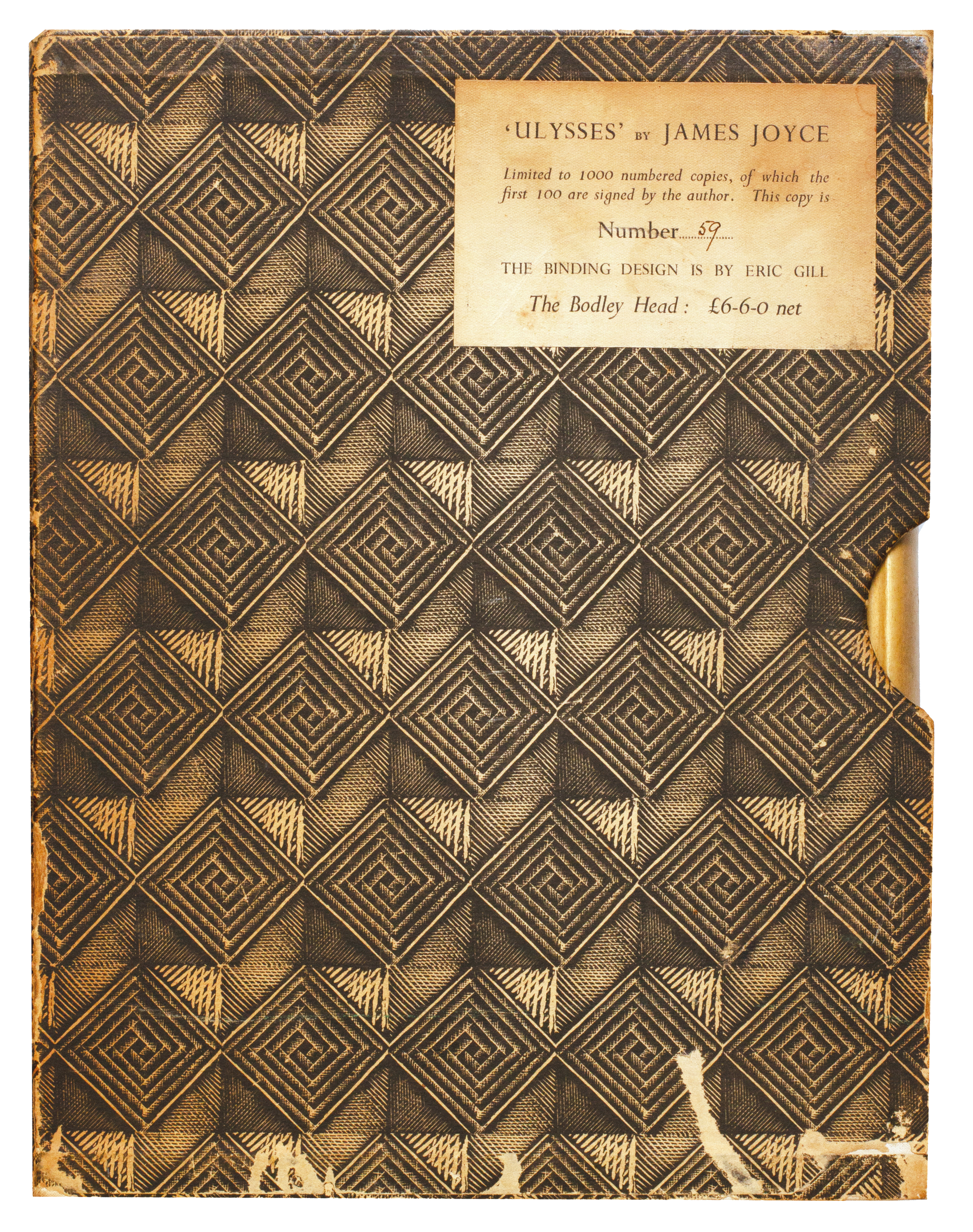 pp. xiii, 765, (i). Large 8vo. (264 x 204 mm). Half-title, printed title in blue and black, leaf with justification and production credits verso, leaf with list of 'Previous Editions of 'Ulysses'', leaf with details of the appendices and Joyce's text concluding 'Trieste-Zürich-Paris, 1914-1921' and appendices. Original publisher's full vellum designed by Eric Gill with gilt bow vignette to front and rear boards, cream endpapers, title gilt to spine, a.e.g., original patterned paper-covered board slipcase with white paper label with printed titles and matching copy number in ink.