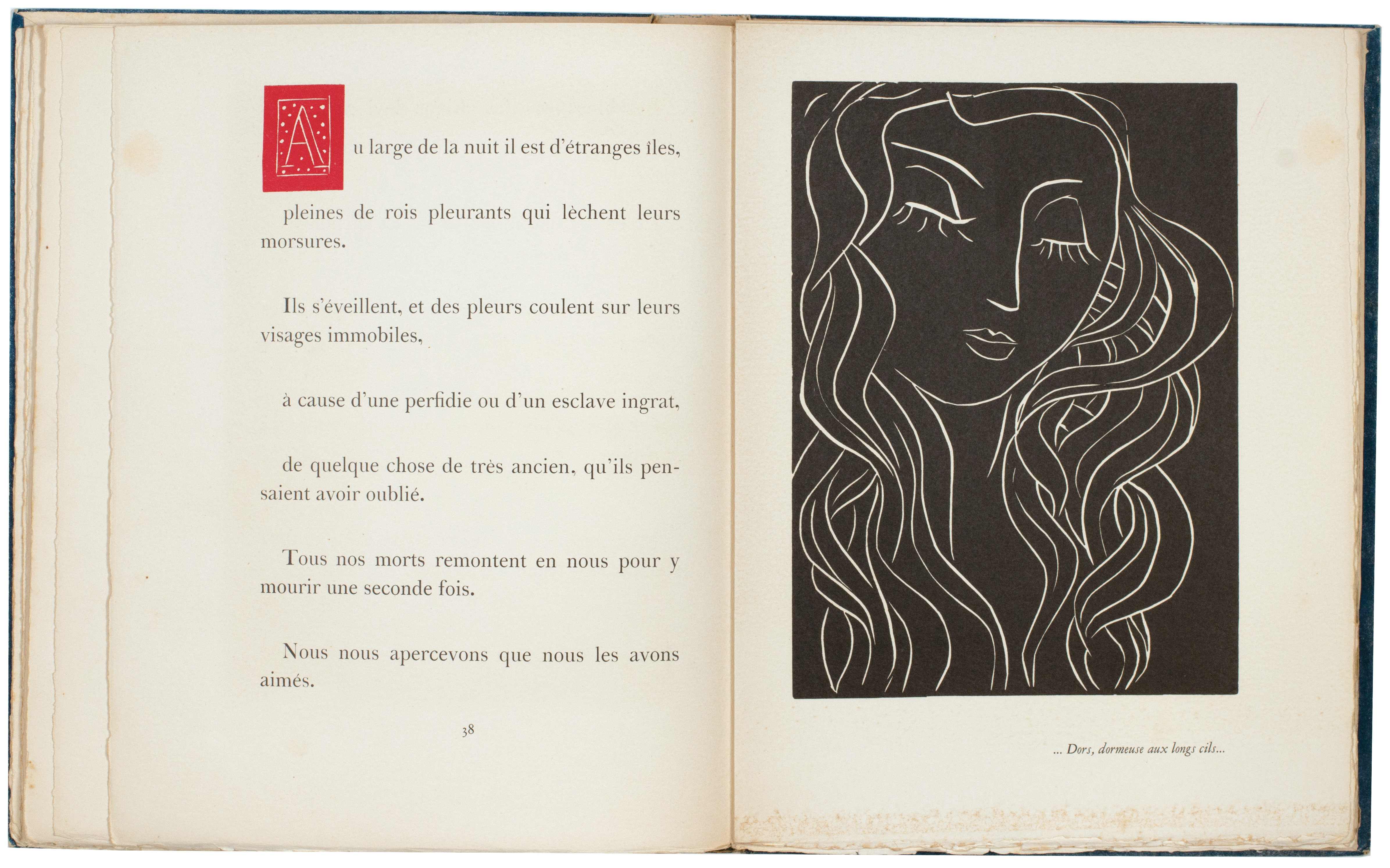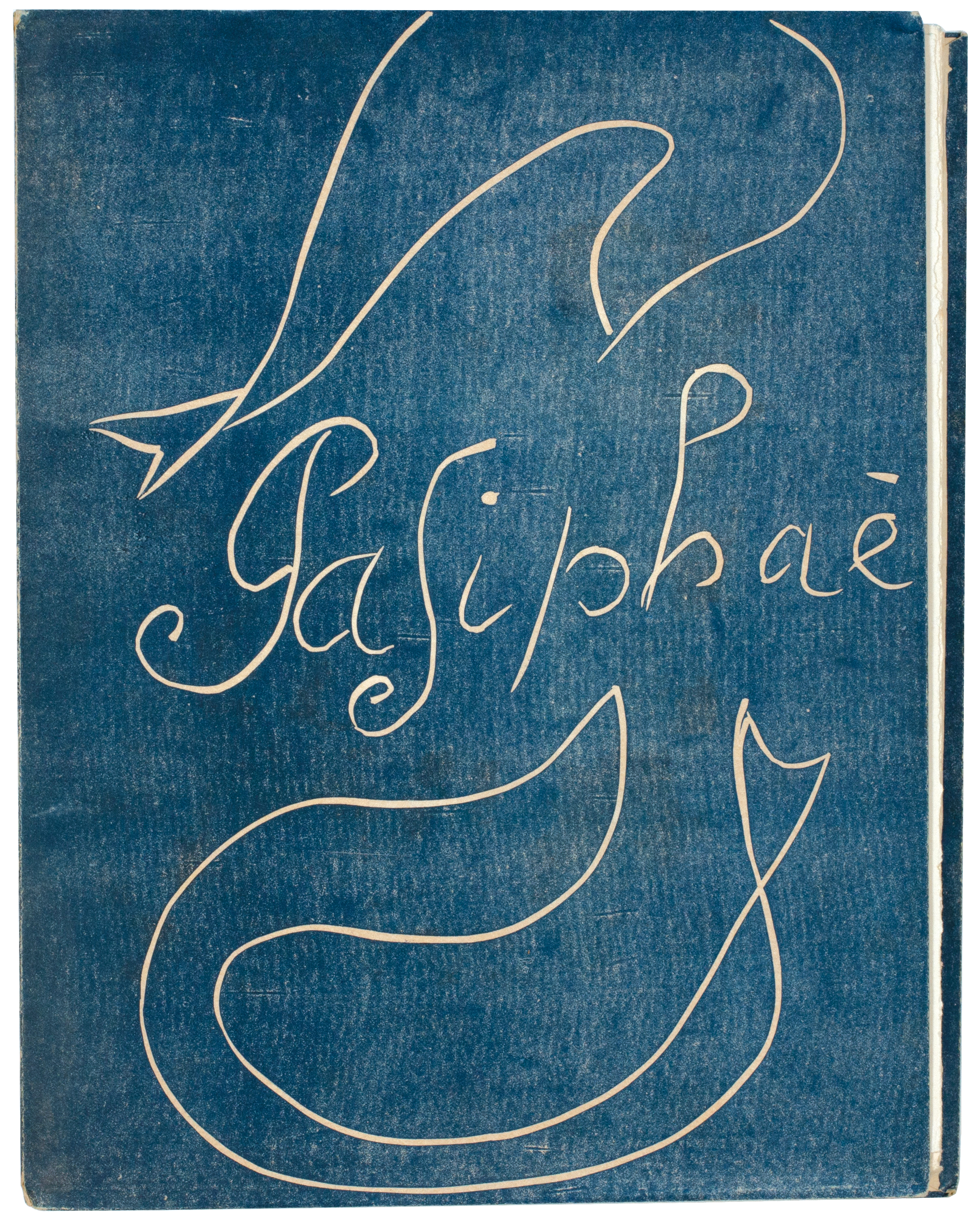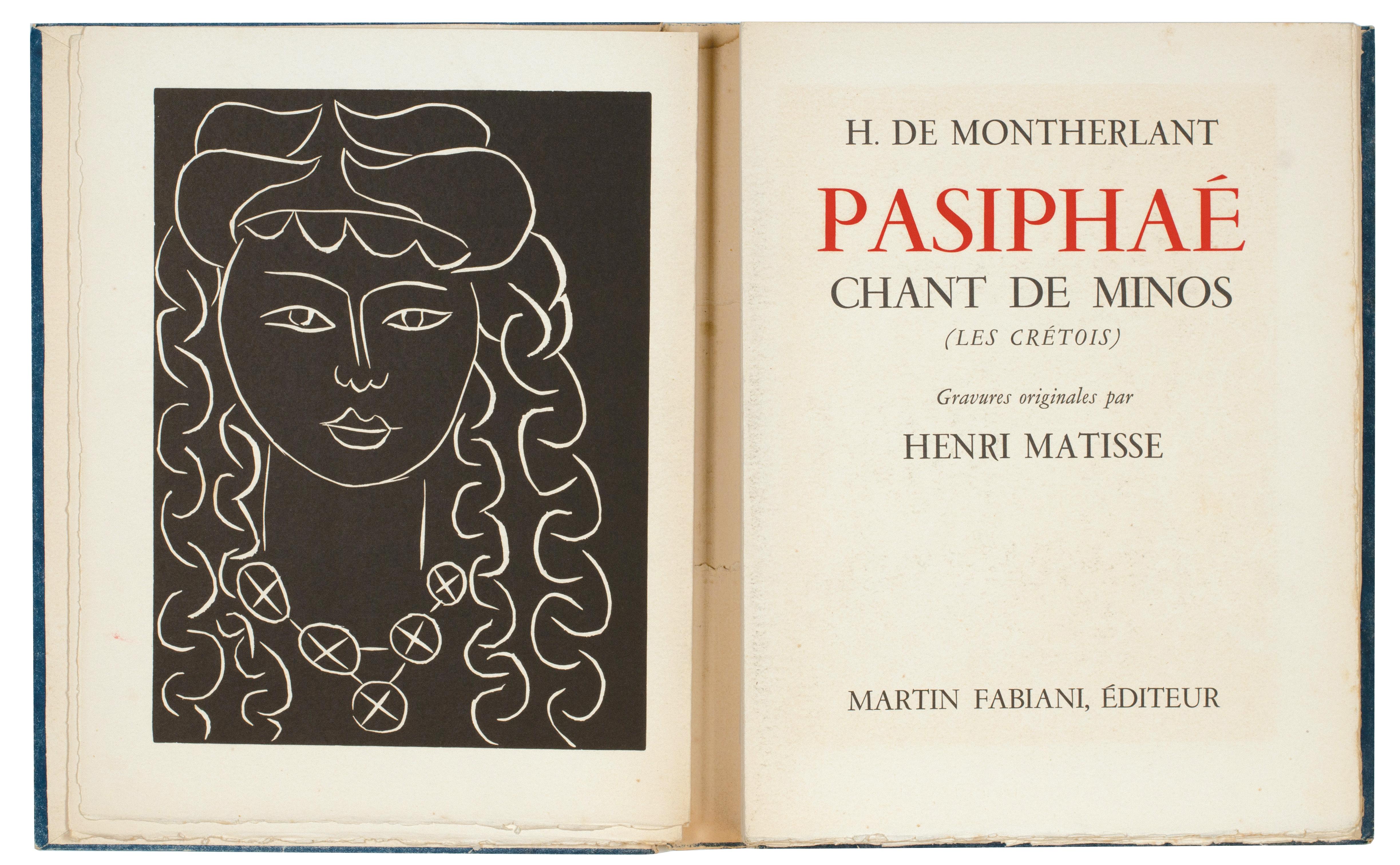 [68 leaves including blanks; pp. 121, (i), (i), (i), (i)]. 4to. (336 x 260 mm) Half-title, justification verso, original linoleum engraved frontispiece, printed title in red and black, de Montherlant's introduction and text for the 'Chant de Minos' and 'Pasiphaé' illustrated with 17 full-page original linoleum engravings printed in black, 33 vignettes including head- and tail-pieces also in black, 13 repeated headbands in red and 84 initials also in red, leaf with notes and final leaf with achevé d'imprimer, all the original linoleum cuts by Henri Matisse; the wrapper for the book also features an original linoleum cut over both covers printed in blue. Original publisher's printed wrappers with flaps, original linoleum cut illustration and title by Matisse in blue and white, original publisher's cream cloth-backed patterned board chemise with title in red to spine, without slipcase.