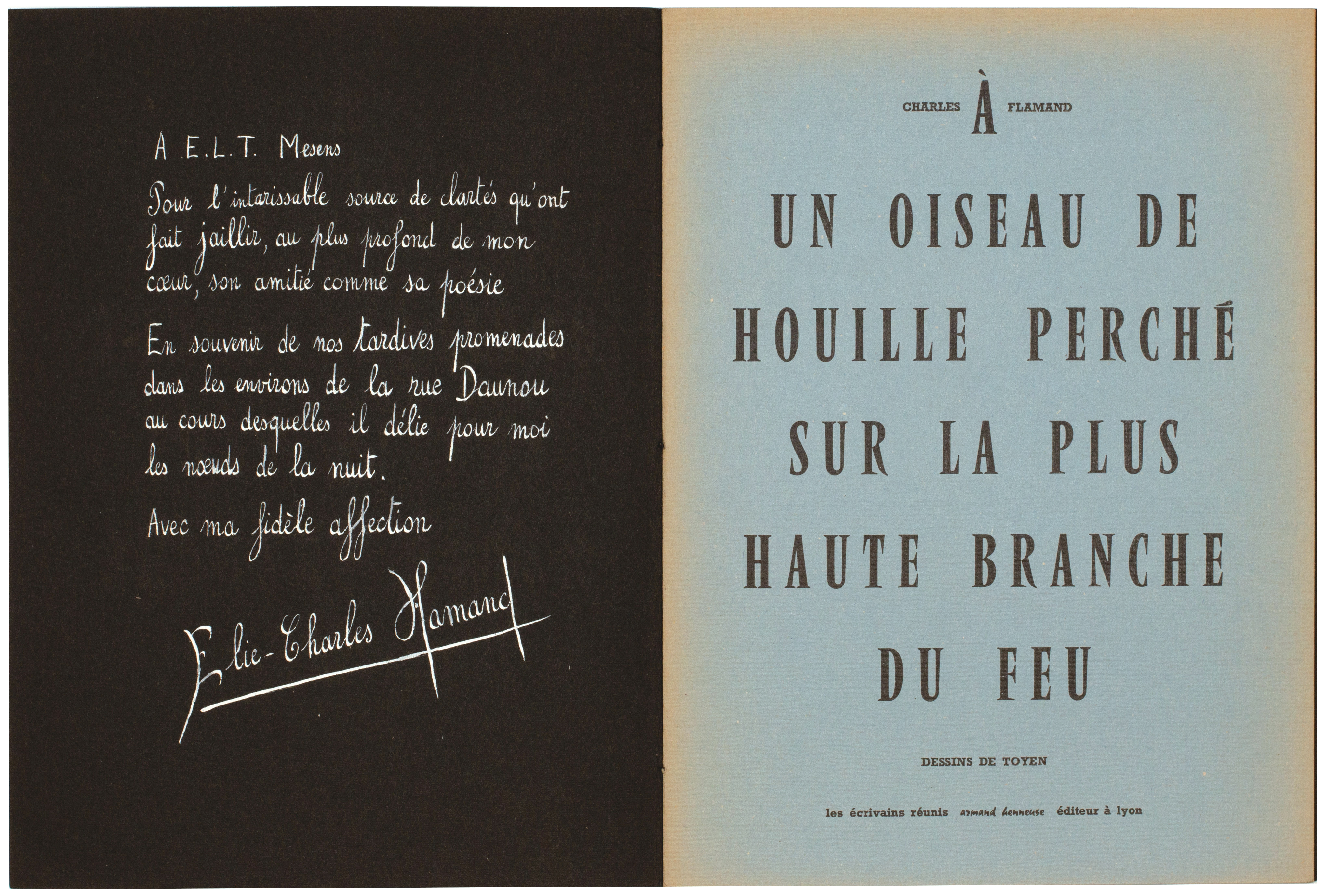 Flamand's long presentation to E. L. T. Mesens is in white ink to the front wrapper verso: 'A E. L. T. Mesens / Pour l'intarissable source de clartés qu'ont / fait jaillir, au plus profond de mon / coeur, son amitié comme sa poésie / En souvenir de nos tardives promenades / dans les environs de la rue Daunou / au cours desquelles il délie pour moi / les noeuds de la nuit. / Avec ma fidèle affection / Elie-Charles Flamand'.
