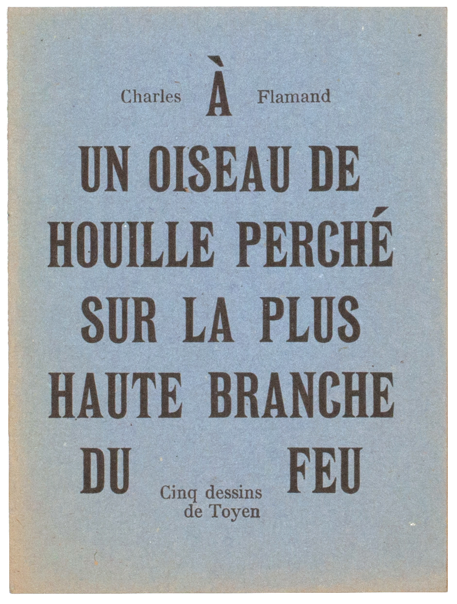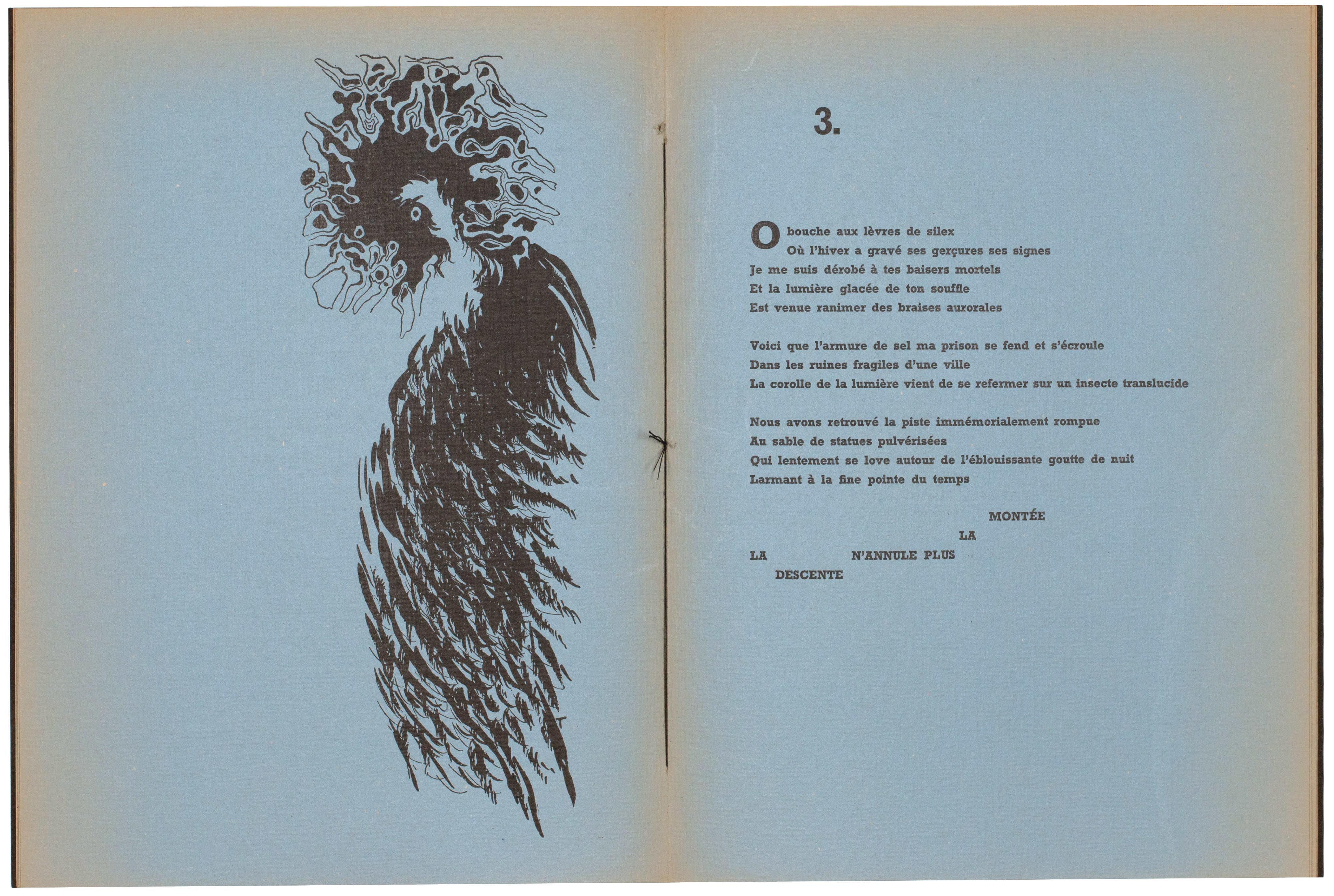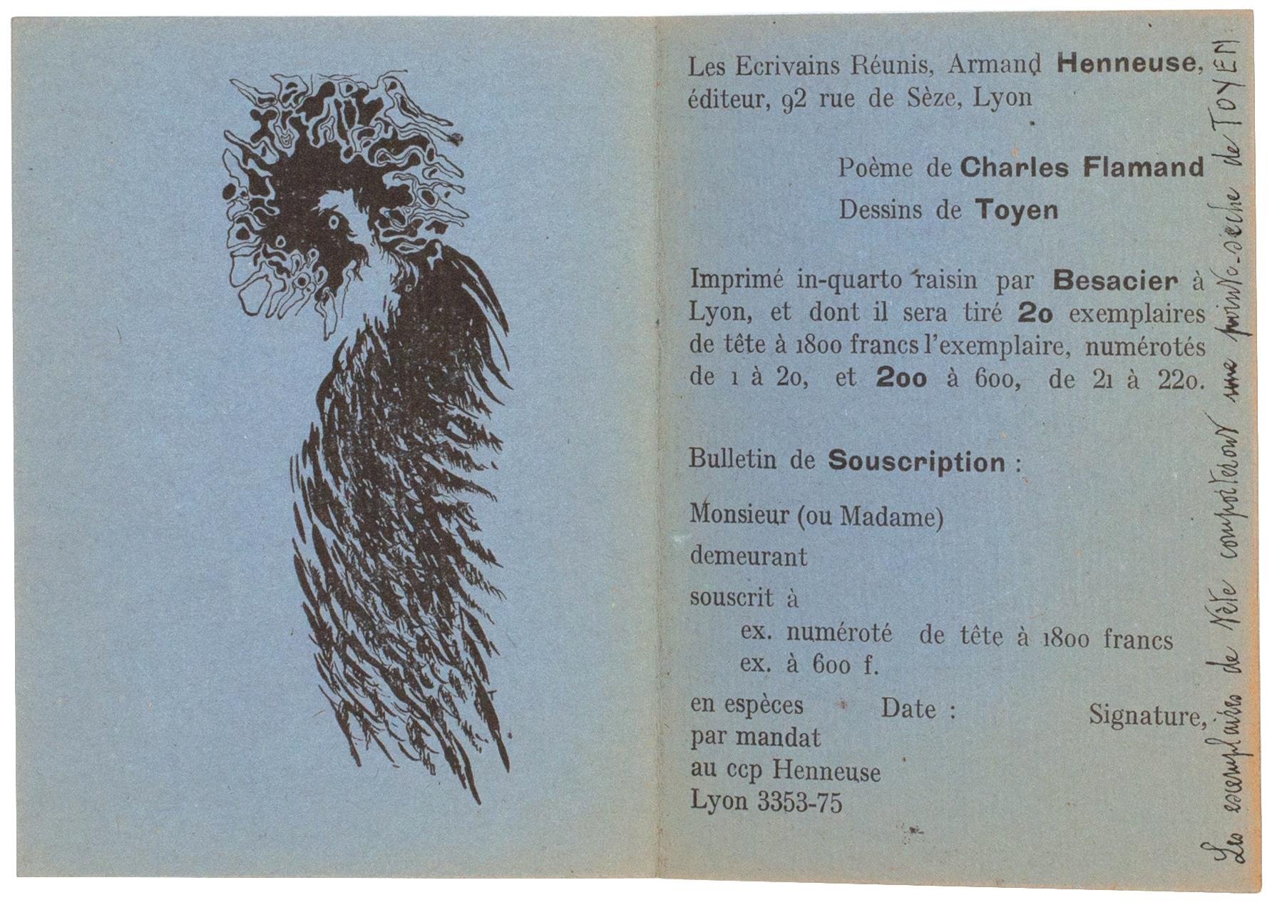Also included, inserted loose, is the folded prospectus, a sheet of blue printed card (folded: 140 x 105 mm; unfolded: 140 x 210 mm) with title, an illustration by Toyen and details of the edition with the additional note by Flamand tin black ink: 'Les exemplaires de tête comporteront une pointe-sèche de TOYEN'.