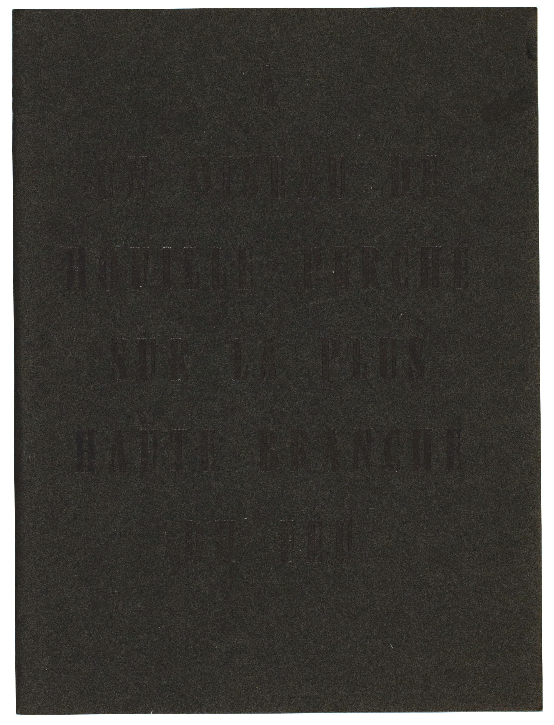 [4 bifolia: 8 unnumbered leaves]. Small folio. (315 x 235 mm). Presentation in white ink (see below) to front wrapper verso, leaf with title, verso with dedication 'pour andrée', leaf with opening quotation recto and illustration by Toyen verso and Flamand's verse in 5 sections (dated 'Lyon-Paris, juin 1953' at the conclusion), each with an illustration by Toyen (5 in total), final leaf with achevé d'imprimer and justification recto. Original publisher's matt black wrappers stitched as issued, titles in relief to front cover.