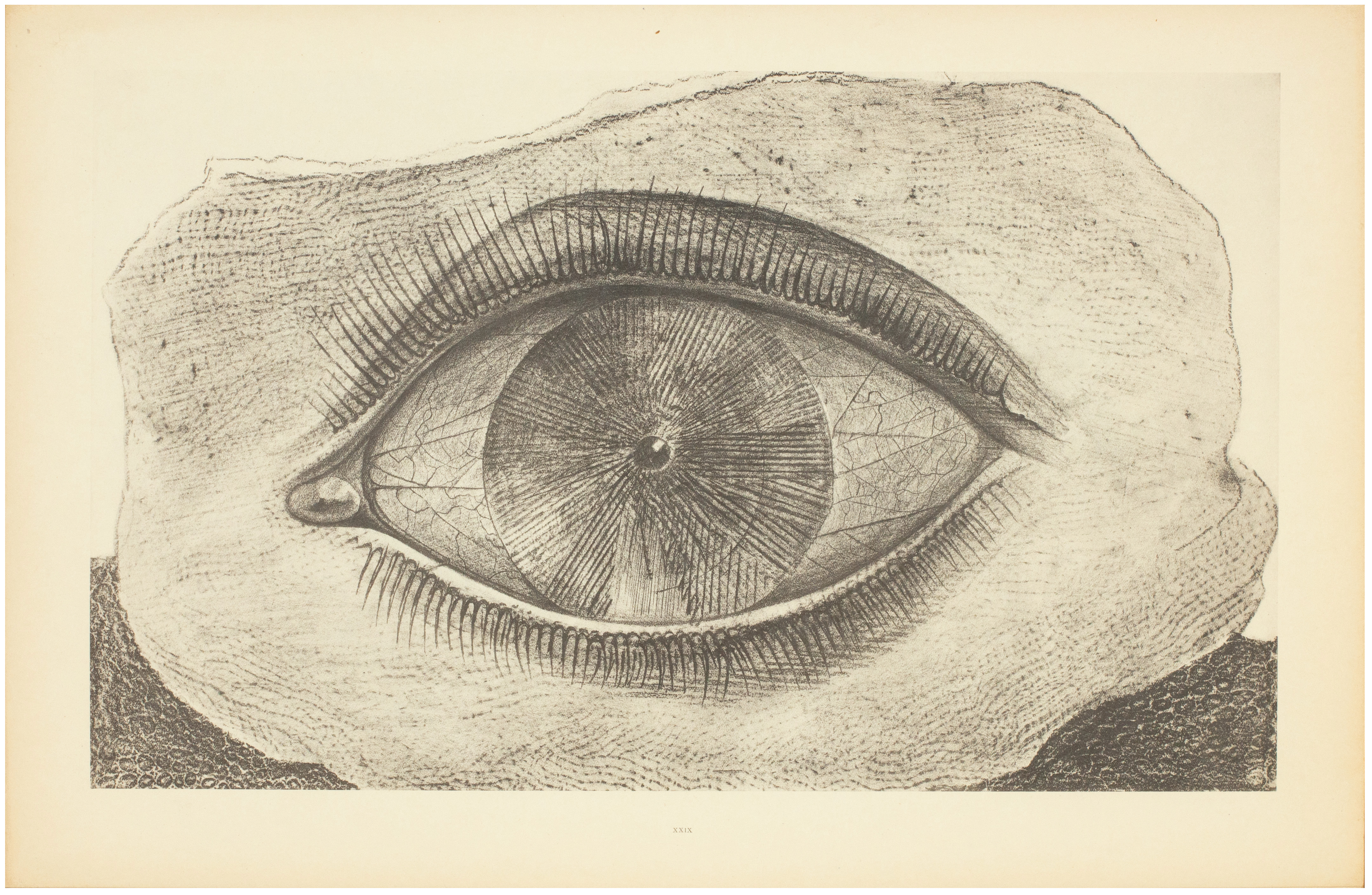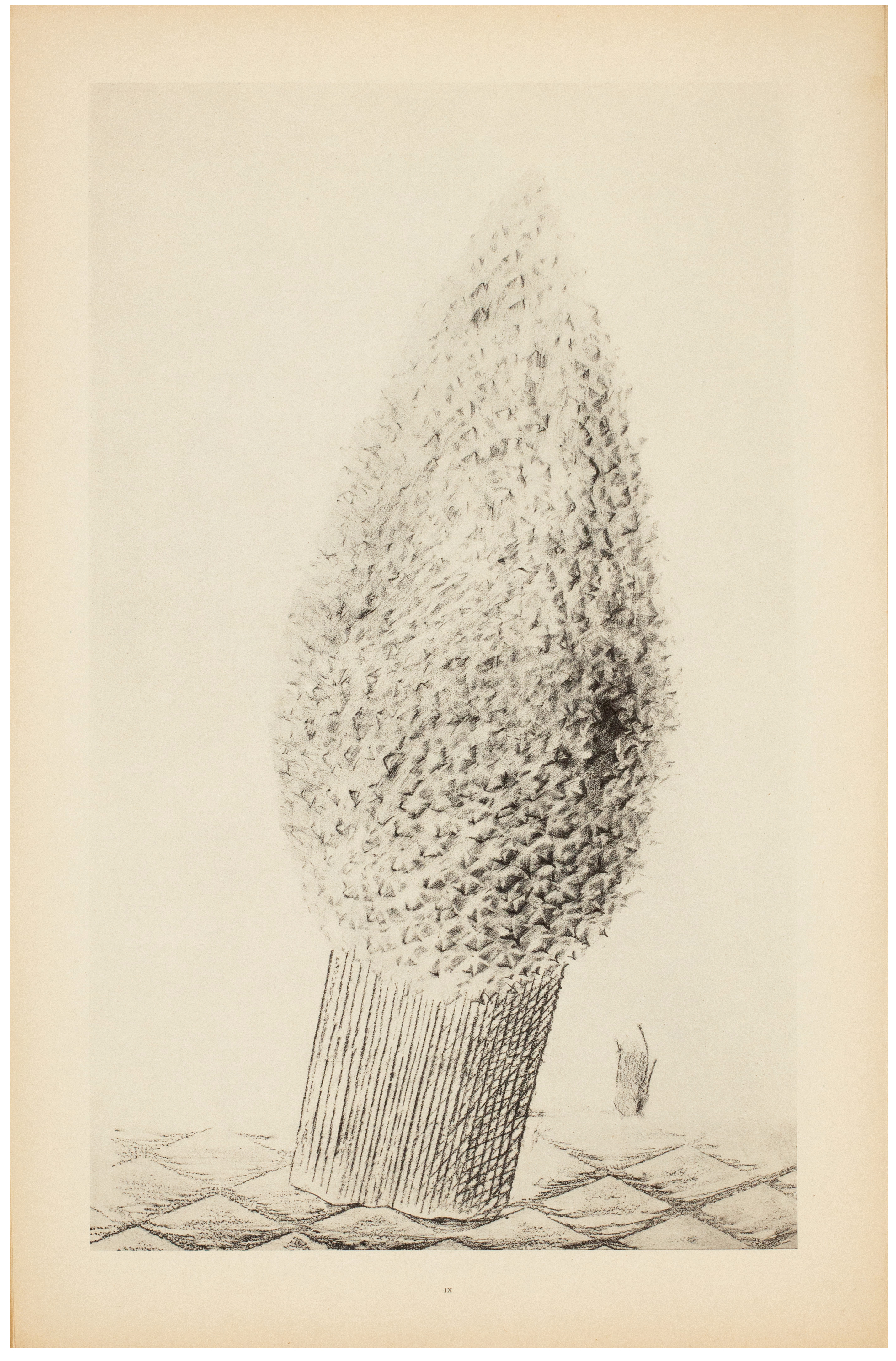 Made during the latter half of 1925, this album represents only a small portion of the hundreds of frottages Ernst produced during that period. Bearing both poetic and descriptive titles (The Fascinating Cypress, The Vaccinated Bread), the plates are introduced by Ernst's dada compatriot Hans Arp by means of a long automatic prose poem. The text is printed without capitals throughout; the final plate ('éve la seule qui nous reste') is misnumbered '43' in the list of plates.