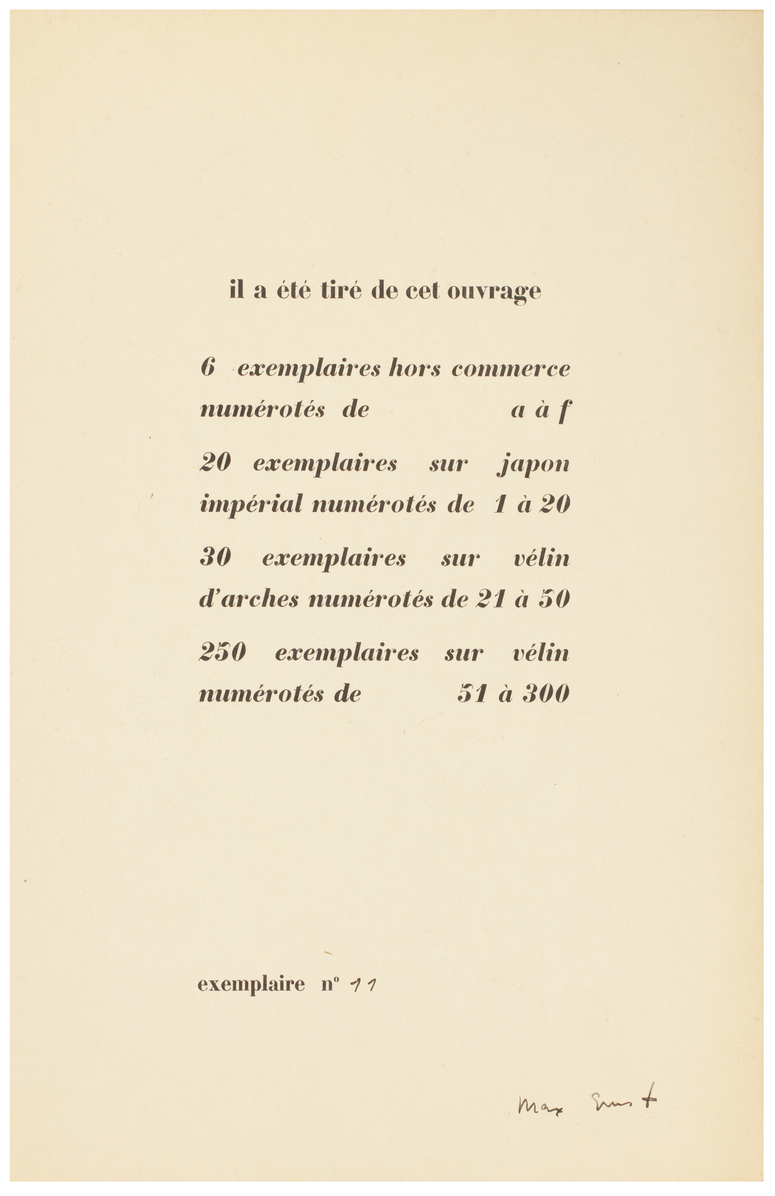 From the edition limited to 300 numbered copies (6 lettered hors commerce copies were also issued), with this one of the first 20 édition de tête copies on Japon Impérial signed and numbered '11' in ink by Max Ernst.