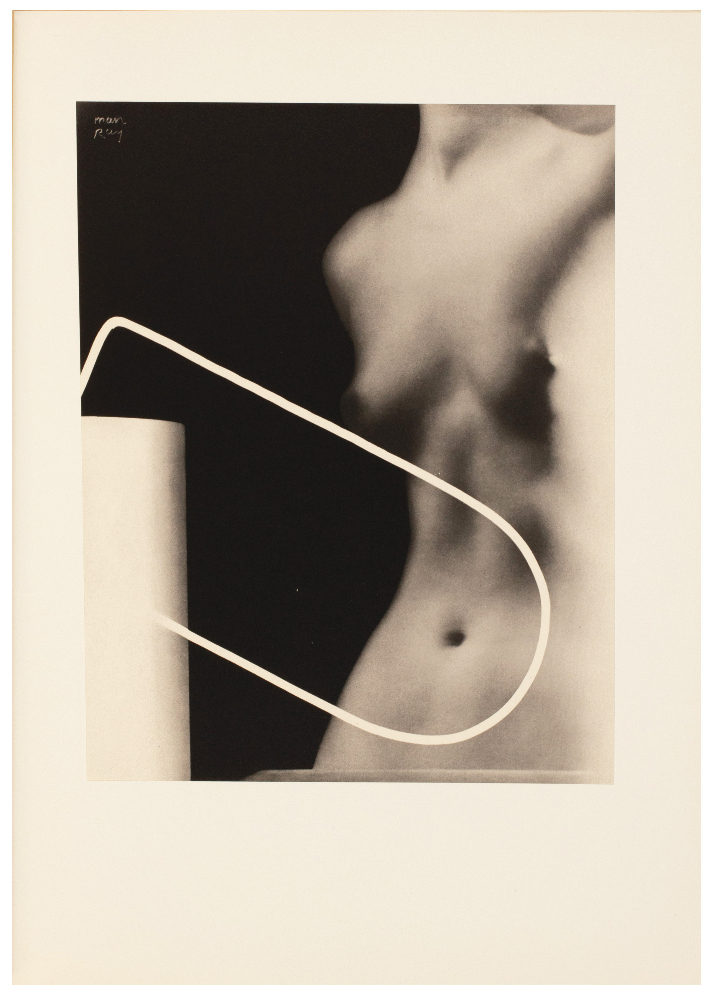 [2 bifolia (text) + 10 leaves of plates]. Folio. (384 x 284 mm). Leaf with title and Bost's text recto and verso and 10 rayographs by Man Ray printed in photogravure, each signed in the plate and mounted to large sheets of card as issued, each within protective glassine bifolium with printed title, justification and achevé d'imprimer to interior of card portfolio; sheet size: 380 x 280 mm. Original publisher's printed card portfolio with typographic design in blue and black. <br>