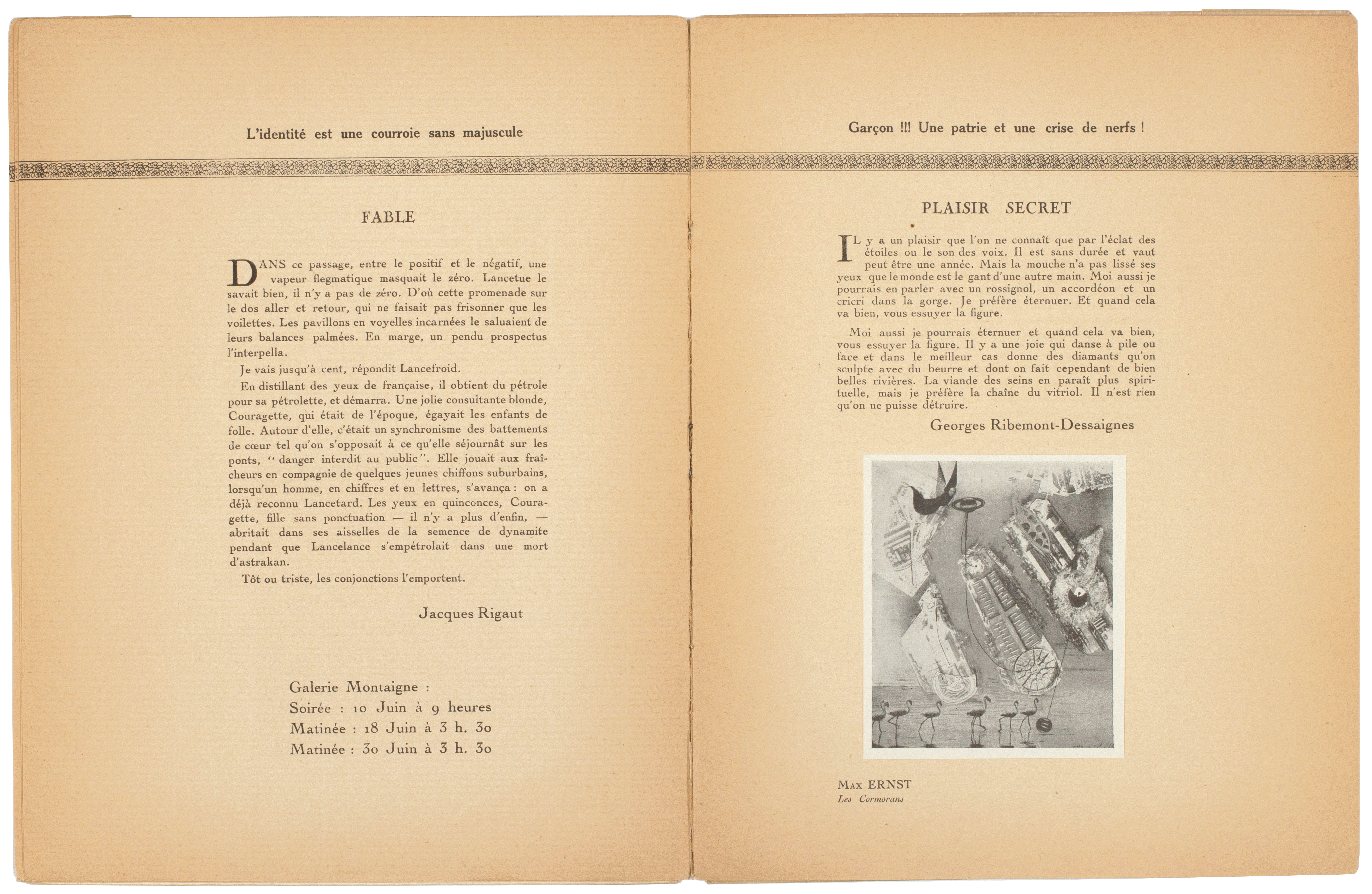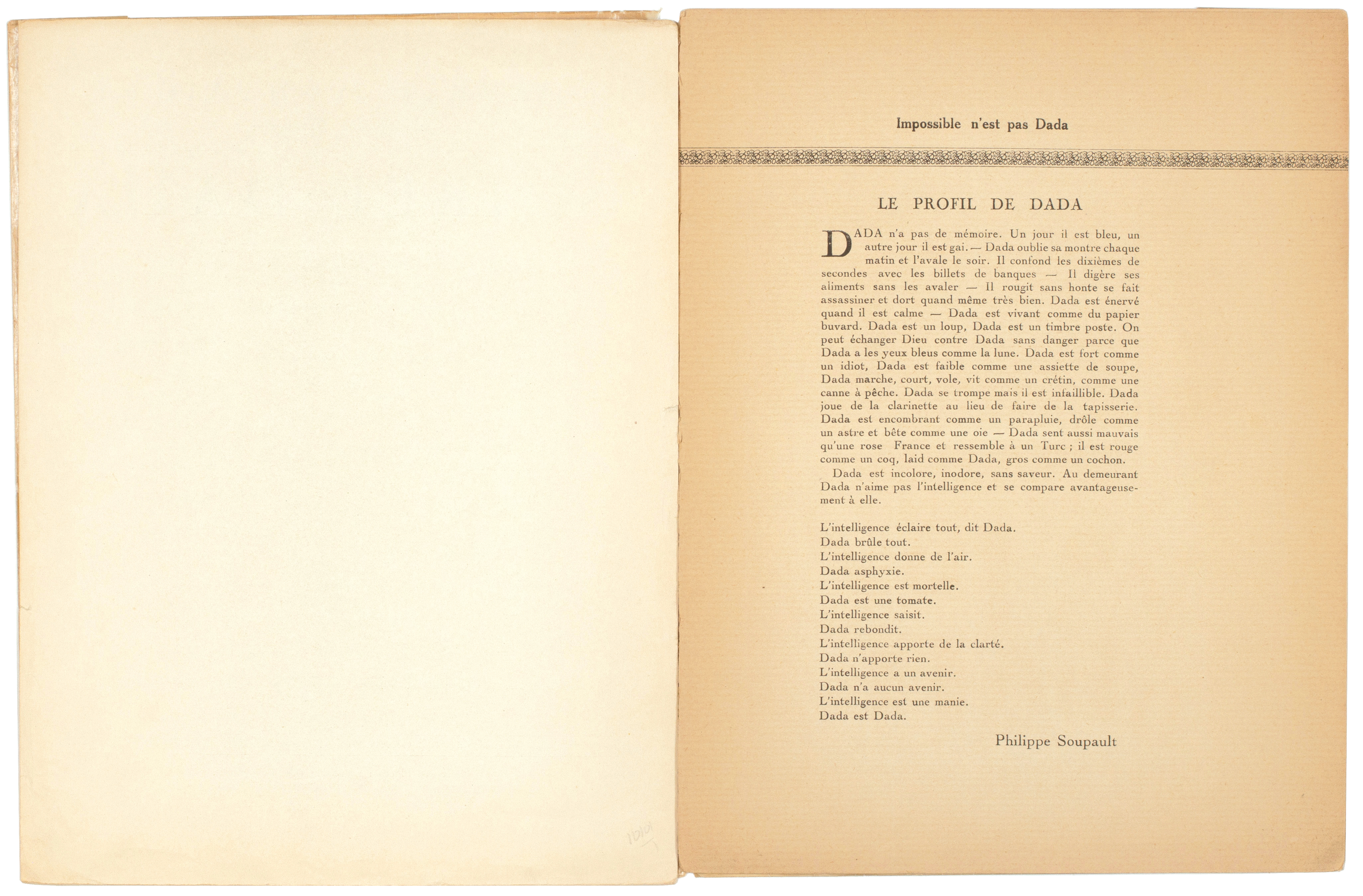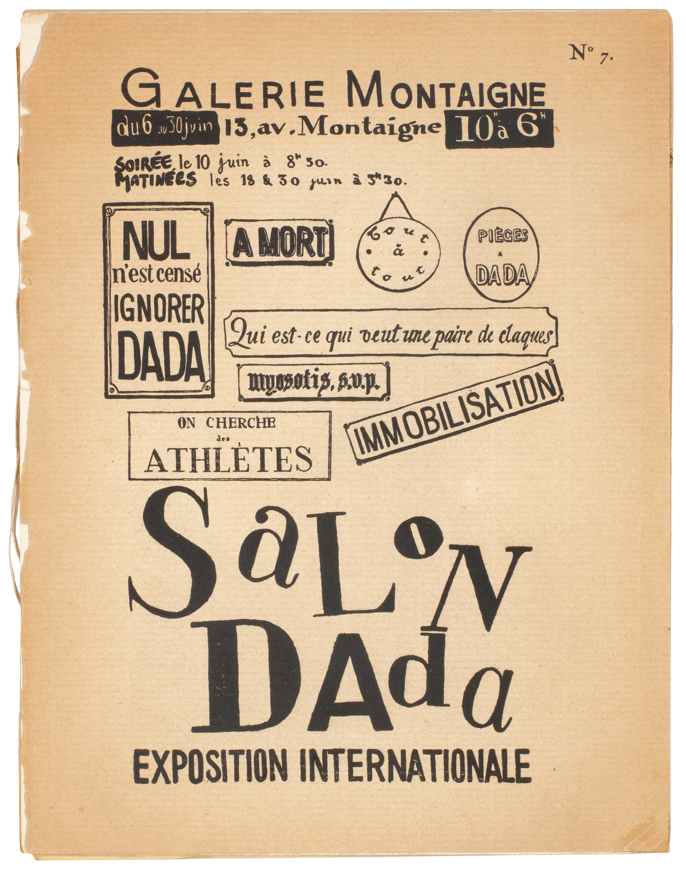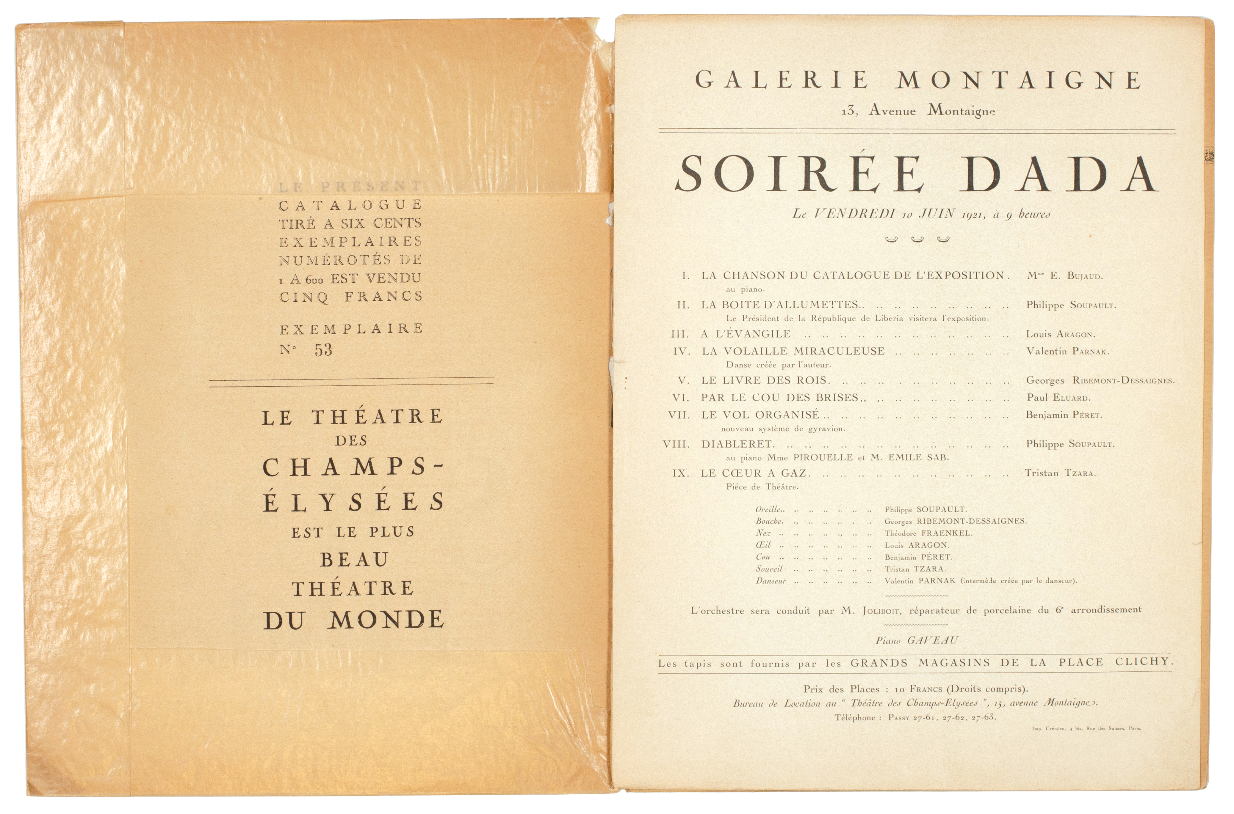Also included, inserted loose, is the announcement for 'Soirée dada'. A single sheet of cream glossy paper printed in black recto only (270 x 206 mm), the announcement details the soirée to be held on June 10th, 1921, at 9 o'clock in the Galerie Montaigne with a programme of nine performances. Tickets were available for 10 Francs and for that price one could have seen the following: I. 'La Chanson du catalogue de l'exposition (au piano)' by Mme E. Bujaud; II. 'La Boite d'allumettes (Le Président de la République de Liberia visitera l'exposition)' by Philippe Soupault; III. 'A l'évangile' by Louis Aragon; IV. 'La Volaille miraculeuse (Danse créée par l'auteur)' by Valentin Parnak; V. 'Le livre des rois' by Georges Ribemont-Dessaignes; VI. 'Par le cou des brises' by Paul Eluard; VII. Le vol organisé (nouveau système de gyravion) by Benjamin Péret; VIII. 'Diableret (au piano Mmme. Pirouelle et M. Emile Sab)' by Philippe Soupault; IX. 'Le coeur à gaz (Pièce de Théâtre)' by Tristan Tzara.