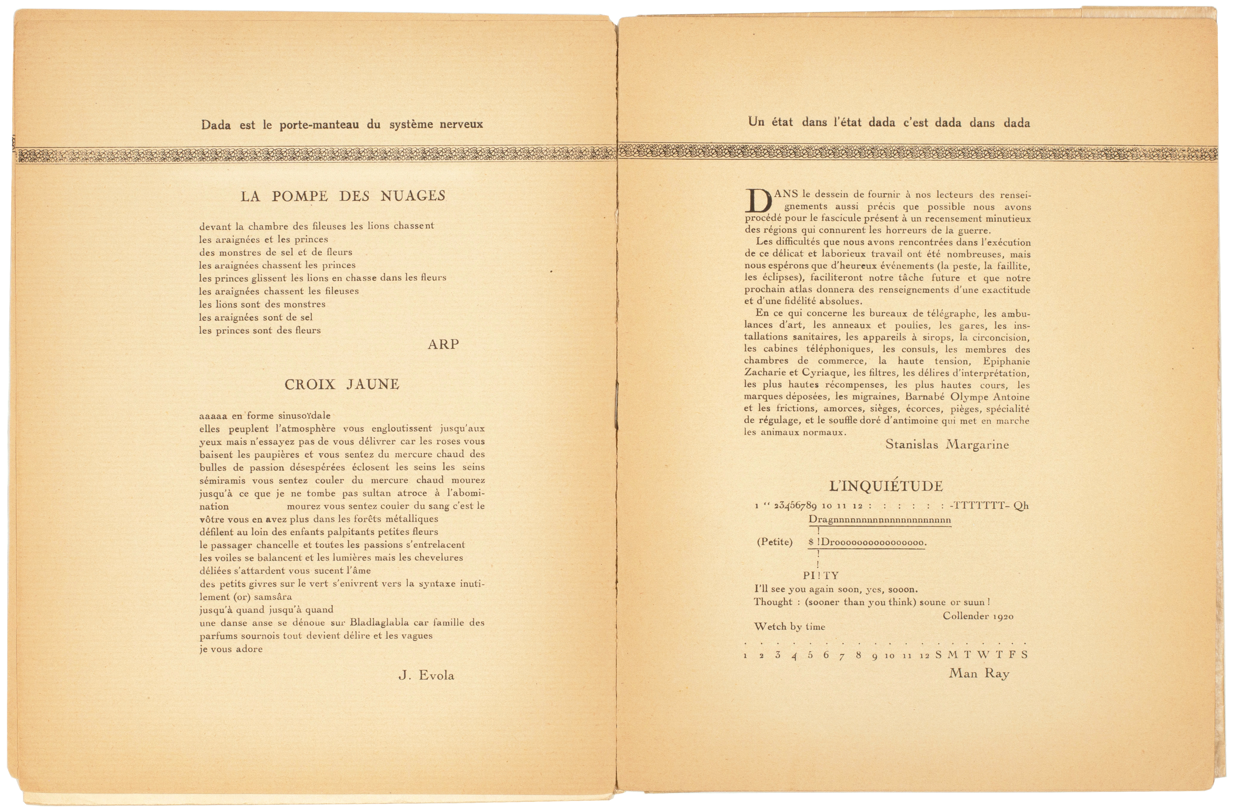 Literary contributors include the aforementioned Soupault ('Le Profil de dada'), Paul Eluard ('L'Ombre aux soupirs'), Arp (as poet: 'Le Pompe des nuages' from the German 'Die Wolkenpumpe'), J. Evola ('Croix jaune'), Stanislas Margarine [sic] (untitled), Man Ray ('L'Inquiétude'), Jacques Rigaut ('Fable'), Georges Ribemont-Dessaignes ('Plaisir secret'), Tzara (as above and 'Epiderme de la nuit croissance'), Benjamin Péret ('Mémoires de Benjamin Péret' and 'Mystère de ma naissance') and Louis Aragon ('Autre procès-verbal').