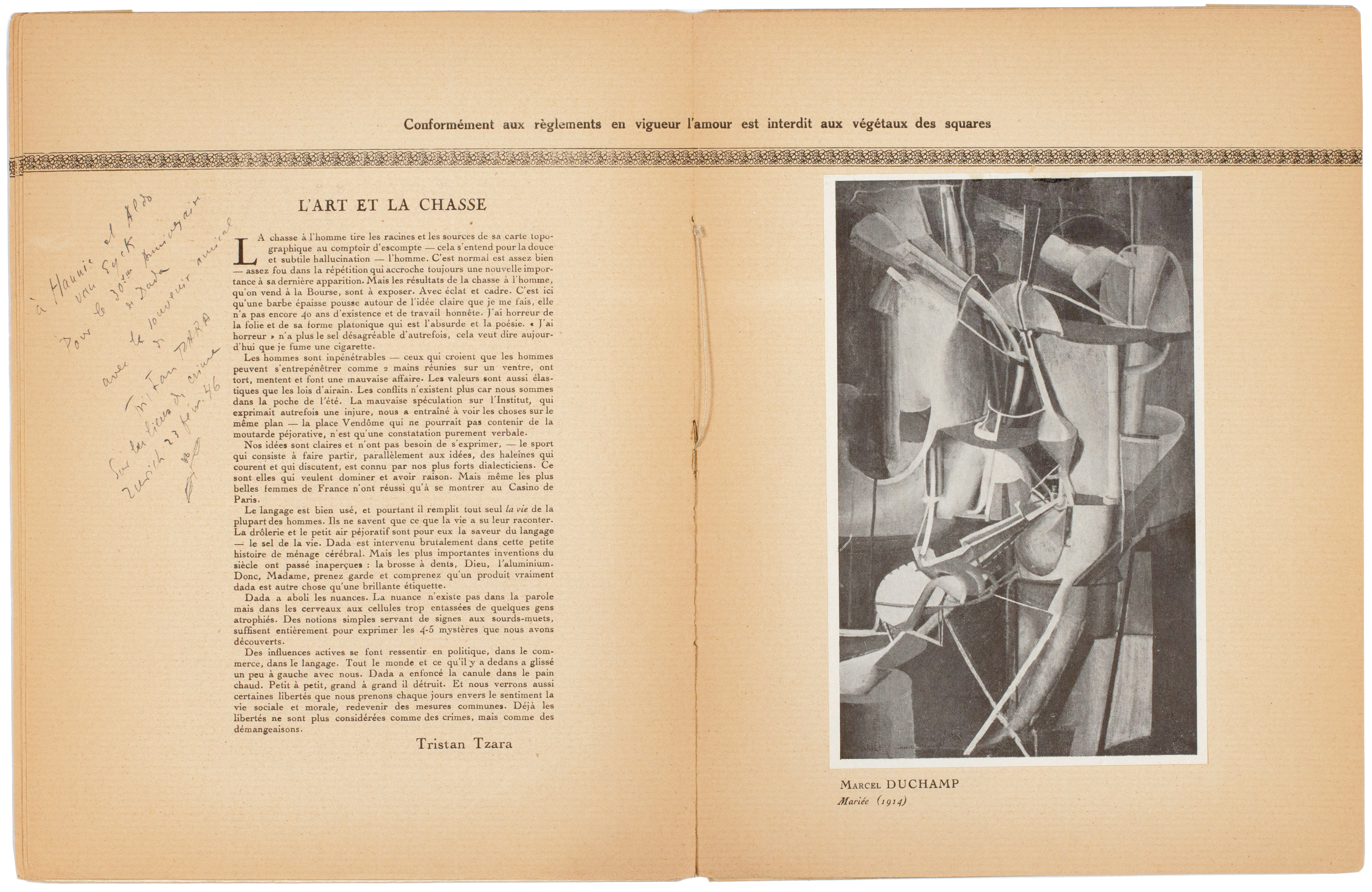 The spread includes (above) the legend 'Conformément aux règlements en vigueur l'amour est interdit aux végétaux des squares', (at left) Tzara's 'L'art et la chasse' and (at right) the tipped-in illustration of Duchamp's 'Mariée'.