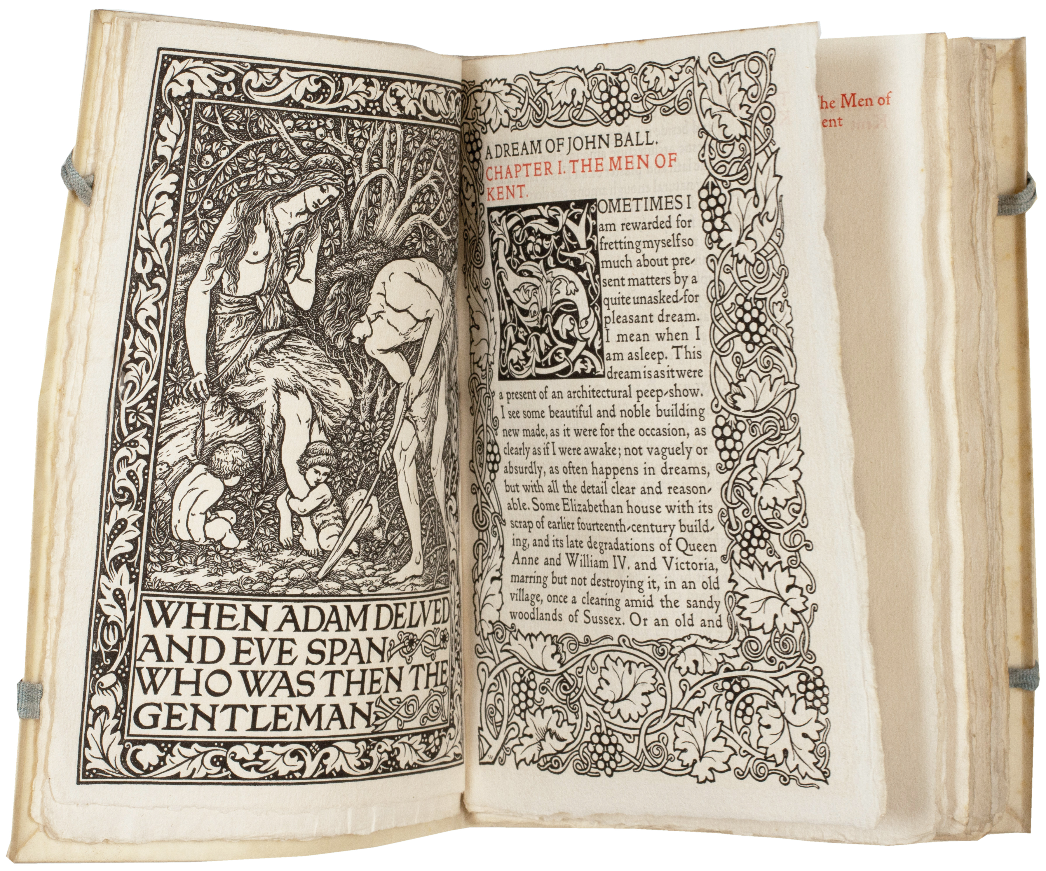 A fine example of the first illustrated book issued by the Kelmscott Press, William Morris' 'A Dream of John Ball'.