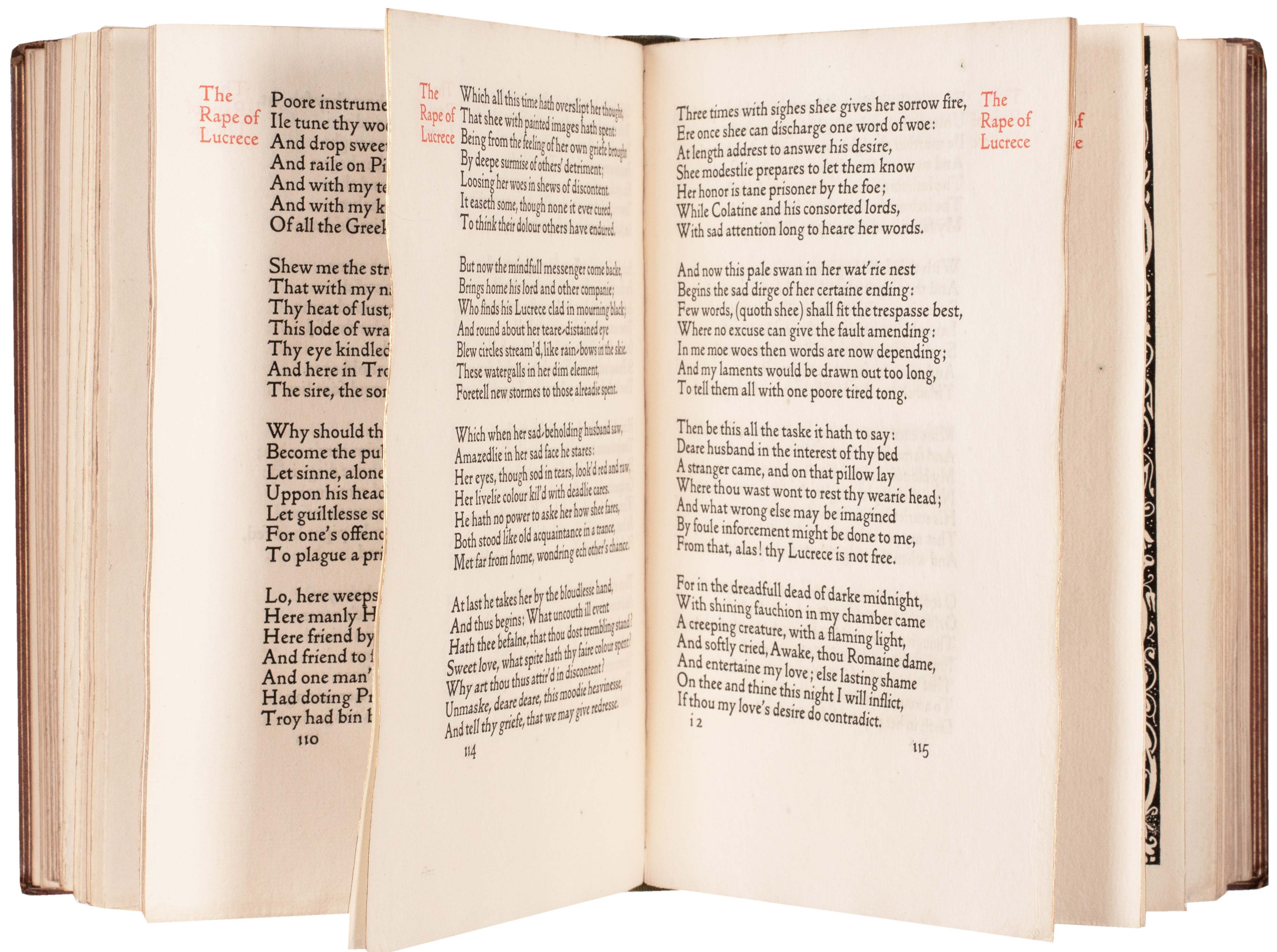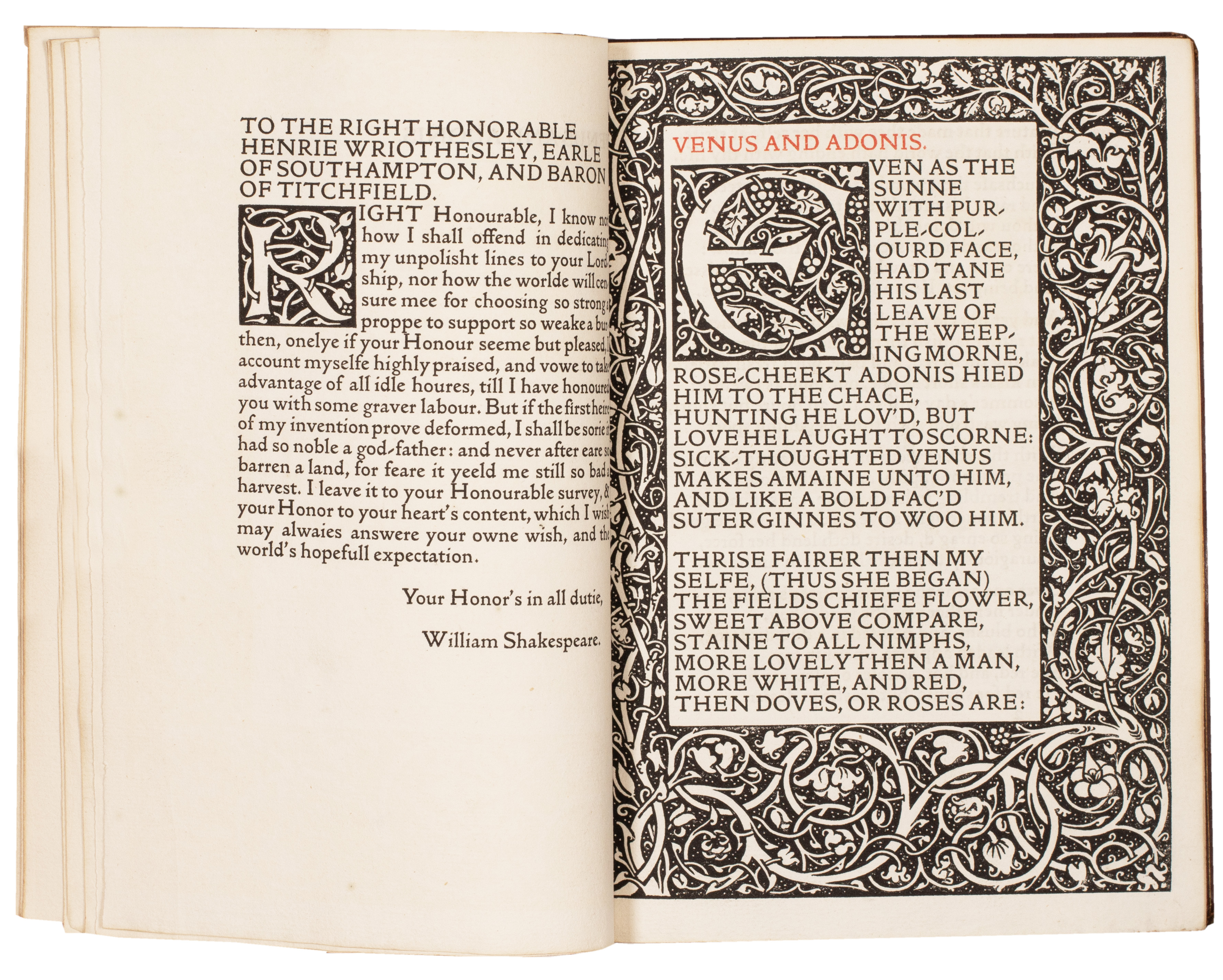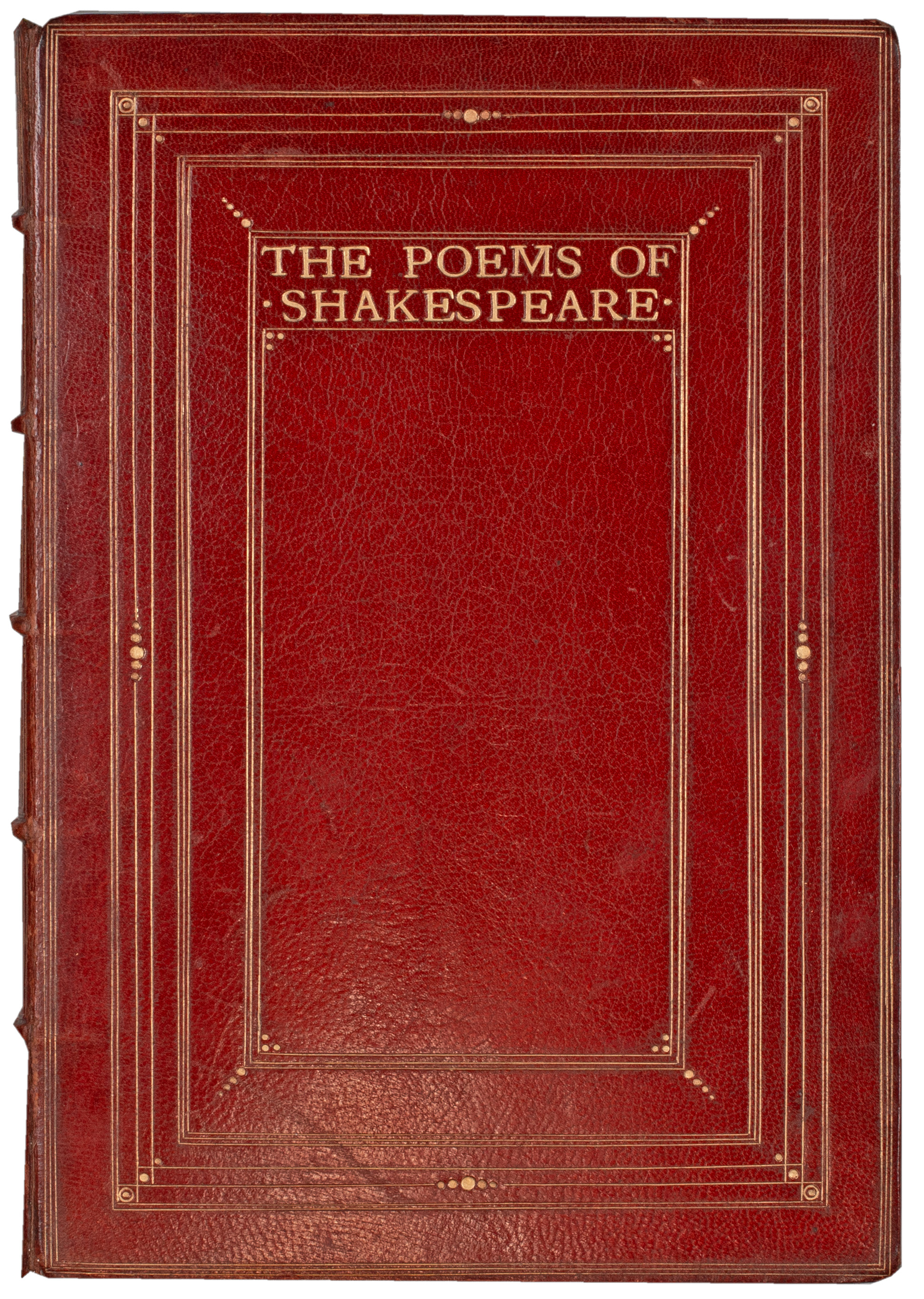 [116 leaves including blanks; pp. (vi), 216, (i)]. 8vo. (208 x 146 mm). Decorative woodcut borders and ten-line decorative woodcut initials to introduce each poem, 6-line decorative woodcut initials throughout, text printed in red and black in Golden type throughout, final leaf with large Kelmscott device and colophon recto. Full red crushed morocco by Hatchards with their signature gilt to rear pastedown, front board with concentric fillets to enclose gilt title 'THE POEMS OF / SHAKESPEARE', decor of pointille tools at corners, sides and head and foot, matching decor to rear board, banded spine with gilt title and gilt decoration in six compartments, turn-ins and board edges with gilt rules, a.e.g.