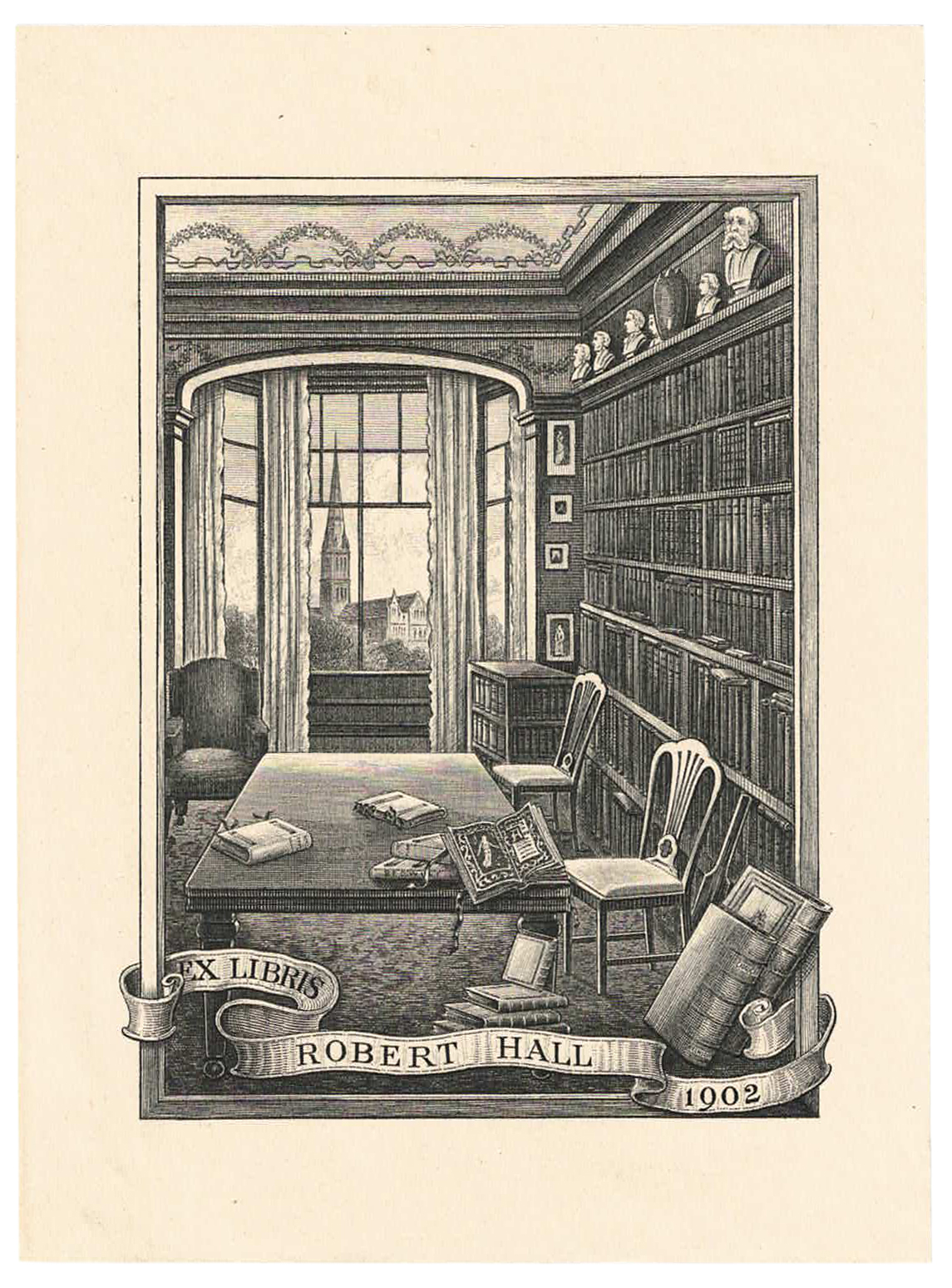 The bookplate of Robert Hall dated 1902, now detached and inserted loose, depicts a contemporary library with a view of a cathedral through the window. Of pertinence here, a number of volumes - all clearly Kelmscotts - are strewn on the table, while lying on the floor and in the foreground are other books and along the right wall are shelves and multiple volumes. The only readily identifiable volume of all those books depicted is a copy of 'The Wood Beyond the World', recognisable by its frontispiece and facing page of text with its Morris border; closer inspection reveals further Kelmscotts: in the foreground is a volume with 'CHAUCER' and 'KELMSCOTT' to the spine, while another, flat on the table' is titled 'BEOWULF' (i.e. 'The Tale of Beowulf'), a third appears to be 'The Glittering Plain' (which version remains unclear), while a fourth may be 'News from Nowhere'.
