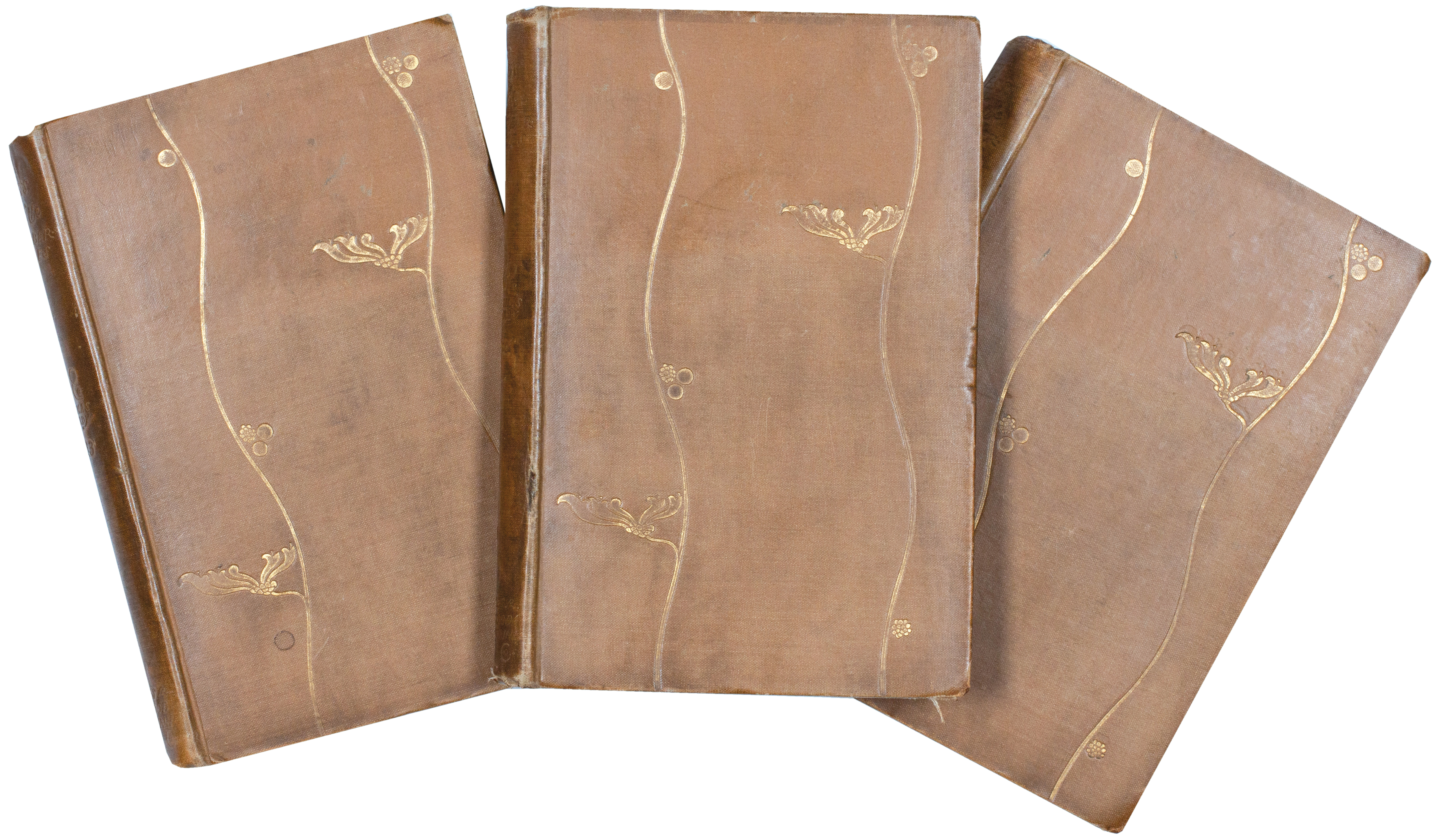 264 pp.; 278 pp.; 277 pp. 3 vols. 8vo. (196 x 138 mm). Half-title, decorative title with copyright verso and contents to each vol., explanatory note to vol. I and chapters I - XXXXX of Hardy's text, printer's credit at conclusion of each vol. Original publisher's honey cloth, front board to each vol. with decorative gilt honeysuckle décor by CHarles RIcketts, titles gilt to spine.