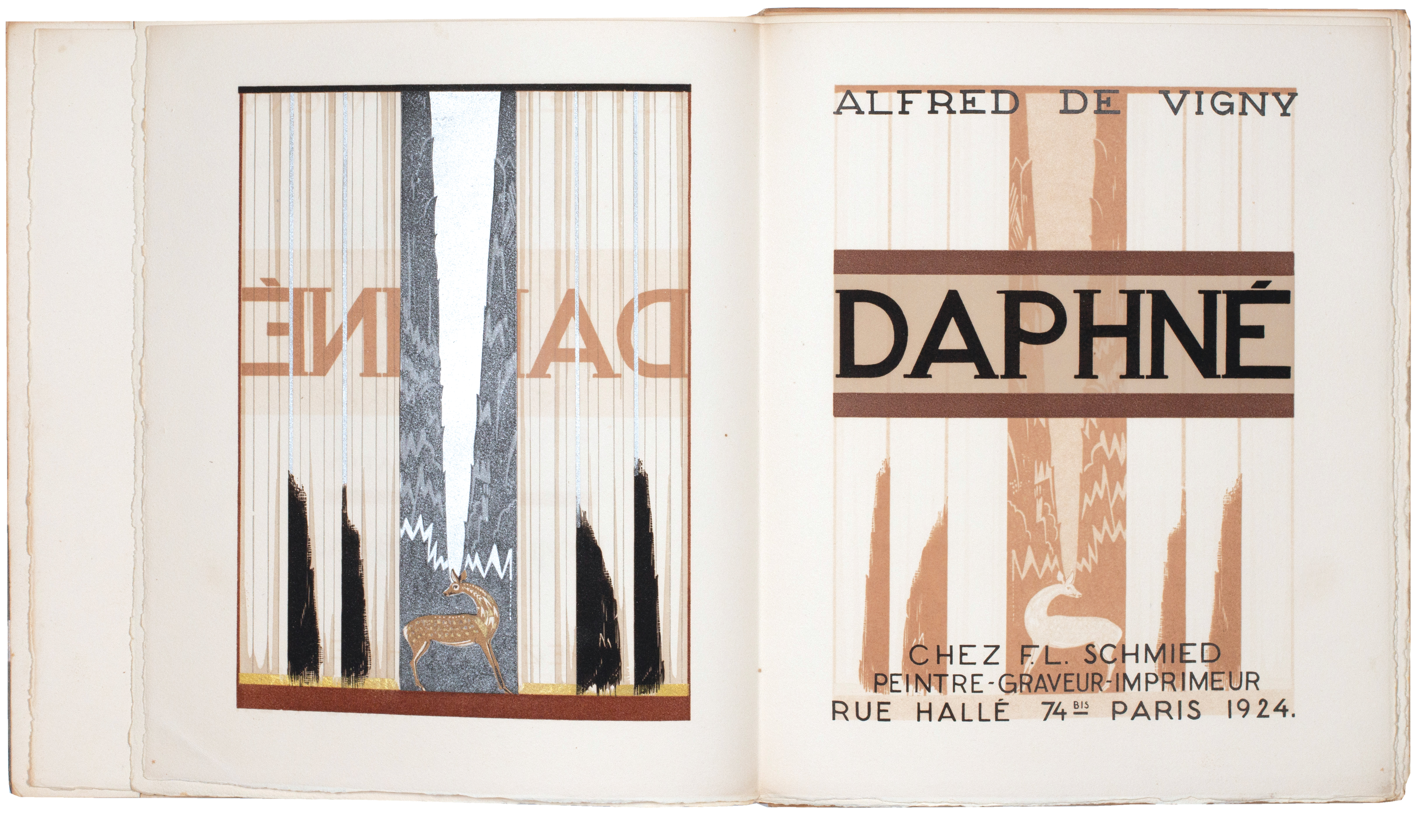 [48 bifolia: 96 unnumbered leaves]. Small folio. (310 x 258 mm). Pictorial title with justification verso, leaf with quotation in Greek from Plato with frontispiece verso, leaf with title in black, brown and bistre and the four letters of de Vigny's text of 'Daphne' illustrated by Schmied with decorative initials, vignettes, bandeaux, head- and tail-pieces and large illustrations of which 5 are full-page, final leaf with achevé d'imprimer; Schmied's illustrations, all wood-engravings printed in colour and with additional argent ink are as follows: pictorial title, full-page frontispiece, 17 large initials, 14 vignettes and head- and tail-pieces, 10 bandeaux and 10 illustrations of which 5 are full-page. Loose as issued in original publisher's thick paper printed wrappers with wood-engraved decoration and argent title with two thick argent bands flowing over the spine to the rear wrapper by Schmied, original marbled paper-covered chemise with paper label with argent title pasted to spine and matching slipcase.