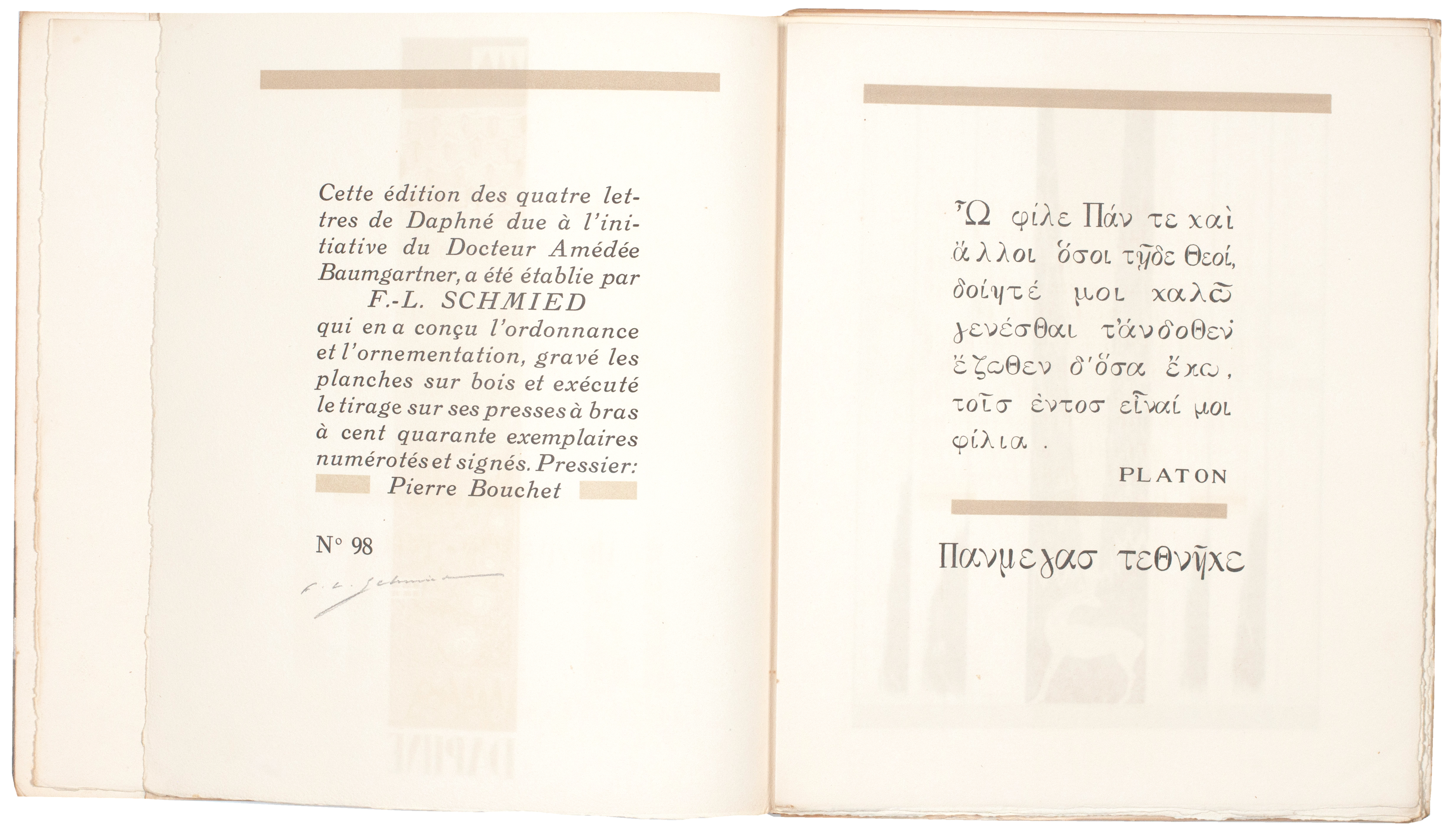 As per the justification: 'Cette édition des quatre lettres de Daphné, due à l'initiative du Docteur Amédée Baumgartner, a été établie par F.-L. Schmied qui en a conçu l'ordonnance et l'ornementation, gravé les planches sur bois et exécuté le tirage sur ses presses à bras à 140 exemplaires numérotés et signés. Pressier: Pierre Bouchet.'