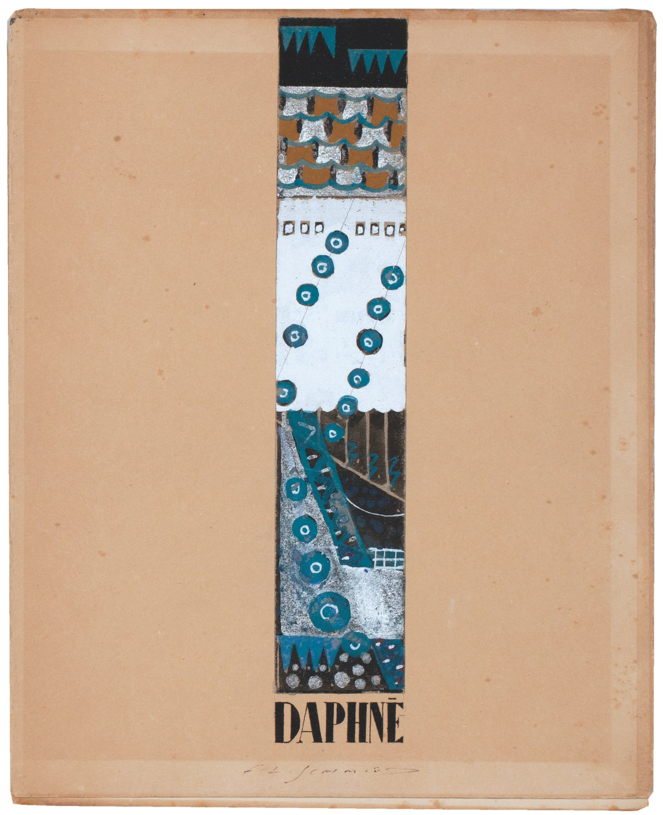 - a blank bifolium matching the paper used for the printed book with Schmied's original painting for the pictorial title: executed in colour gouache and silver paint to a sheet of card, the work is signed by Schmied in ink beneath and mounted over the title 'DAPHNÉ' executed in black ink direct to the sheet; the final verso of the sheet features a proof of printed text for the book pasted to the sheet with Schmied's hand-painted bandeaux above and beneath in umber;