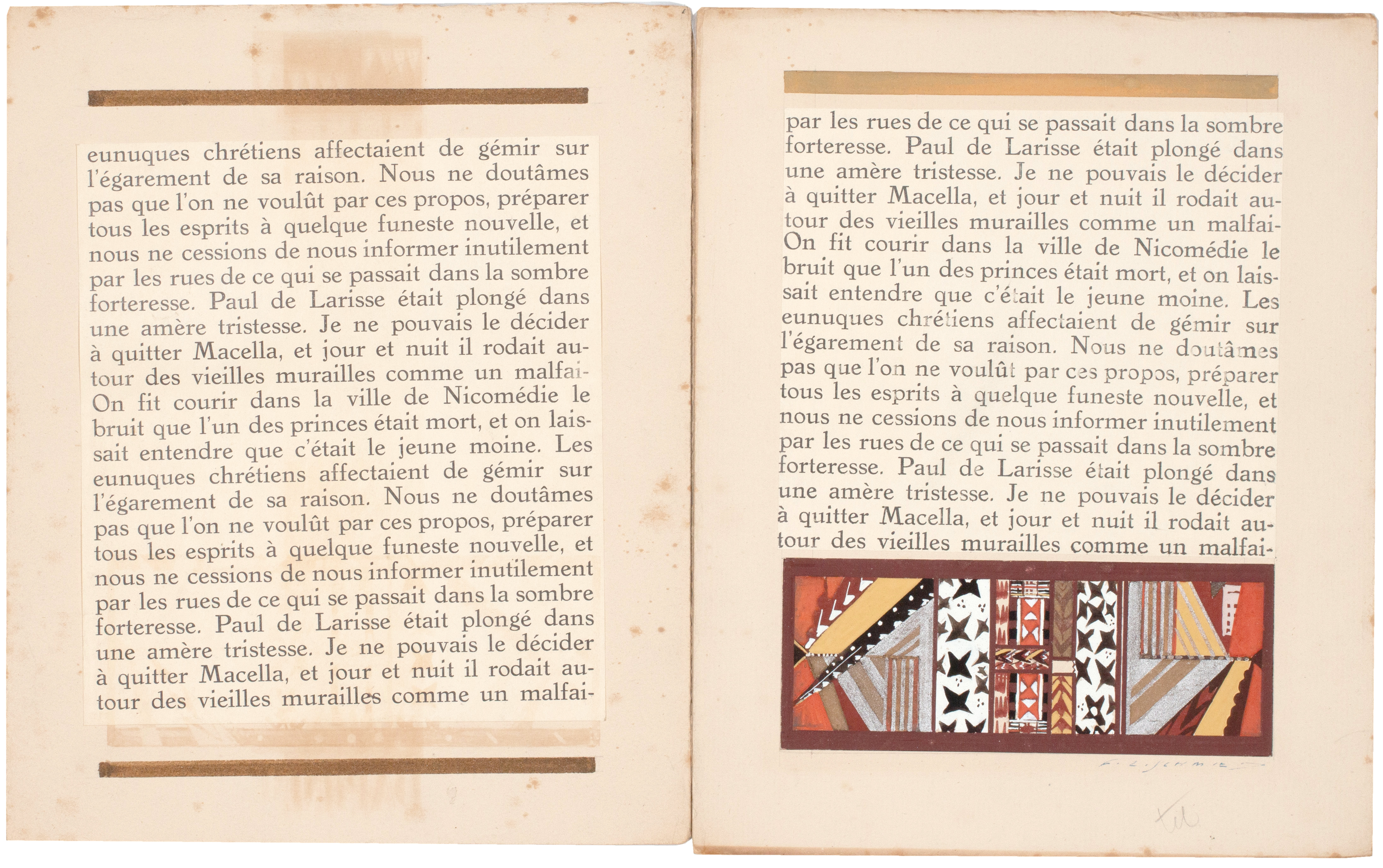 - a blank bifolium matching the paper used for the printed book with Schmied's original painting for the vignette at the foot of a leaf of text: executed in colour gouache and signed at lower right in blue ink, the painting is pasted to the sheet beneath as a proof of printed text for the book (the text matches that of the bifolium detailed above) pasted to the sheet beneath Schmied's painting for the bandeau at the head of the same executed in umber and ochre;