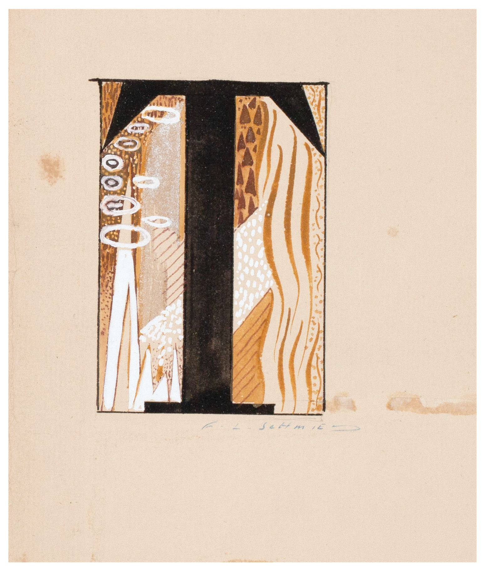 - a single leaf matching the paper used for the printed book with Schmied's original painting for a large initial 'T' used in the book: executed in gouache direct to the sheet, the painting is signed beneath in blue ink by Schmied at lower right;