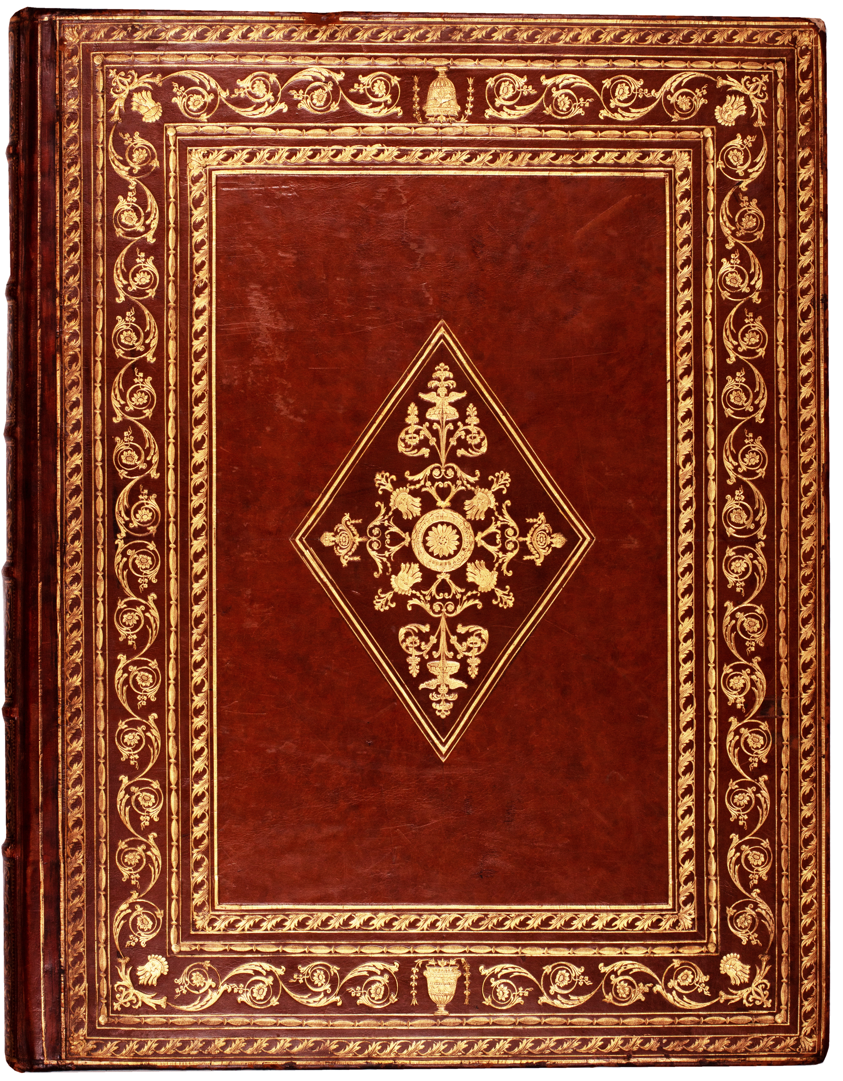 [58 unnumbered leaves]. Folio. (554 x 423 mm). Engraved allegorical title with Latin and German text, leaf with letterpress text in German in double columns and 56 engraved allegorical plates all after the Deckers by various engravers (see below). (Sheet size: 435 x 560 mm). Full contemporary blond calf, boards with elaborate neo-classical decorative borders composed of rules, foliate, floral and rope-work tools, vase tools at head and foot and mask corner tools all to surround a central lozenge with a decorative composition of floral, foliate and mask tools, later banded spine with elaborate decorative tooling in gilt in seven compartments, turn-ins tooled in gilt, red speckled edges.