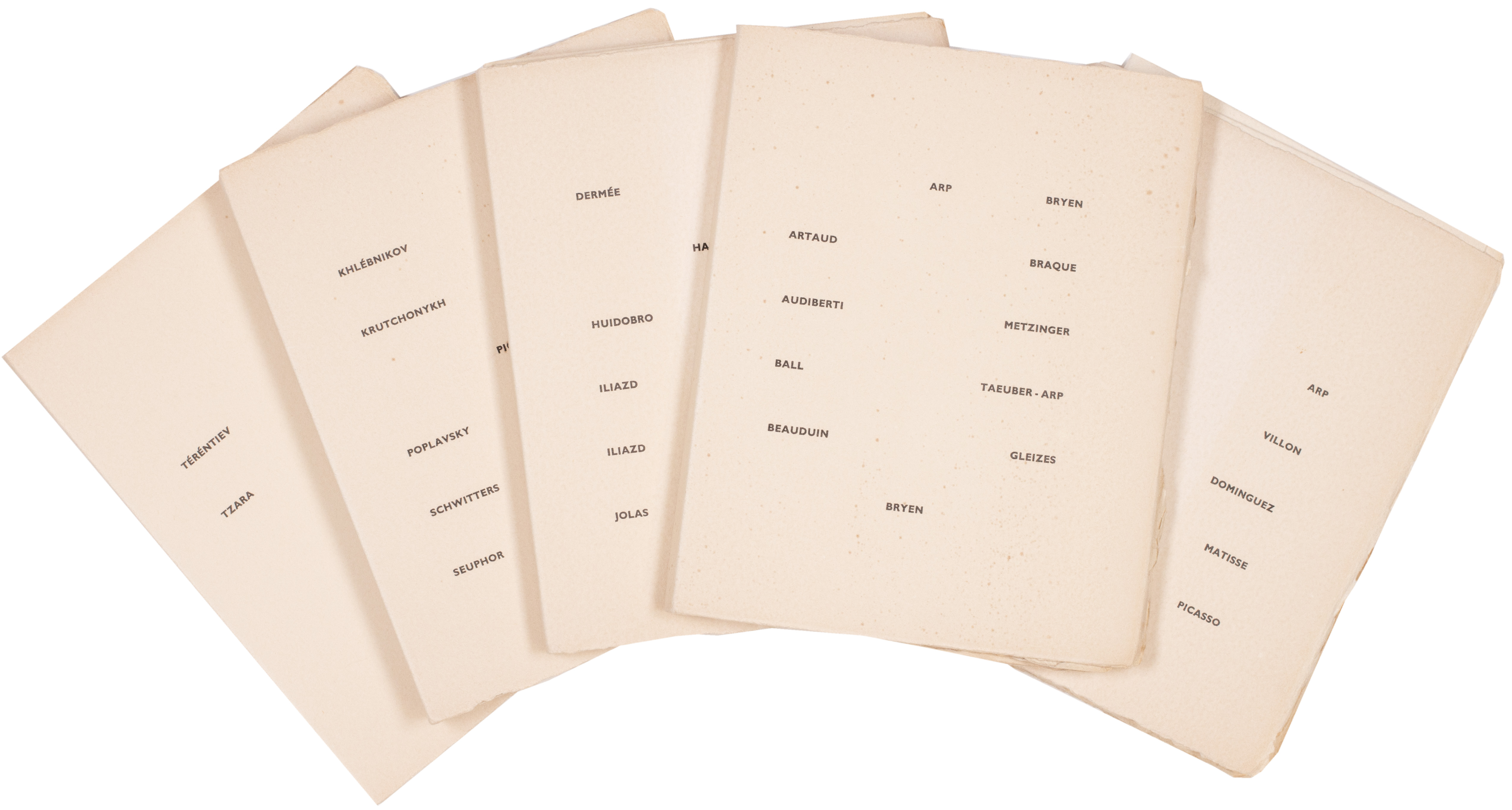 The texts were written between 1910 and 1948, starting with Velimir Khlebnikov and ending with Antonin Artaud, and consist of Russian Futurist texts and Dadaist writings from Paris, Zurich, and Berlin. The book has two formats, folded - as here - and unfolded in sheets and as for all of the books Iliazd published, he did not want the book to be cut or bound (Georges Ribemont-Dessaignes' exhortation 'Ne coupez pas mes pages' is printed in black to the front cover of the volume). For each author, he varies the composition of the page and the book is full of invention typical of this master of mise-en-page. In folded form, the book is solid, compact and almost sculptural, tactile and a beautiful object with a vellum jacket and overjacket with a pleated vellum spine: it is a book that must be handled to be appreciated, explored via manipulation. The importance of the work to Iliazd is clear, even if it brought him much anxiety. After the publication of 'Poésie de Mots Inconnus', Iliazd's oeuvre ceased to be retrospective; the work was the realisation of his highly respected role as editor / publisher / artist and the template for his meticulous future productions. The book was dedicated: 'in recognition of our companions' and the pages were printed by letterpress by Alexander Zasypkine and the Imprimerie Union.