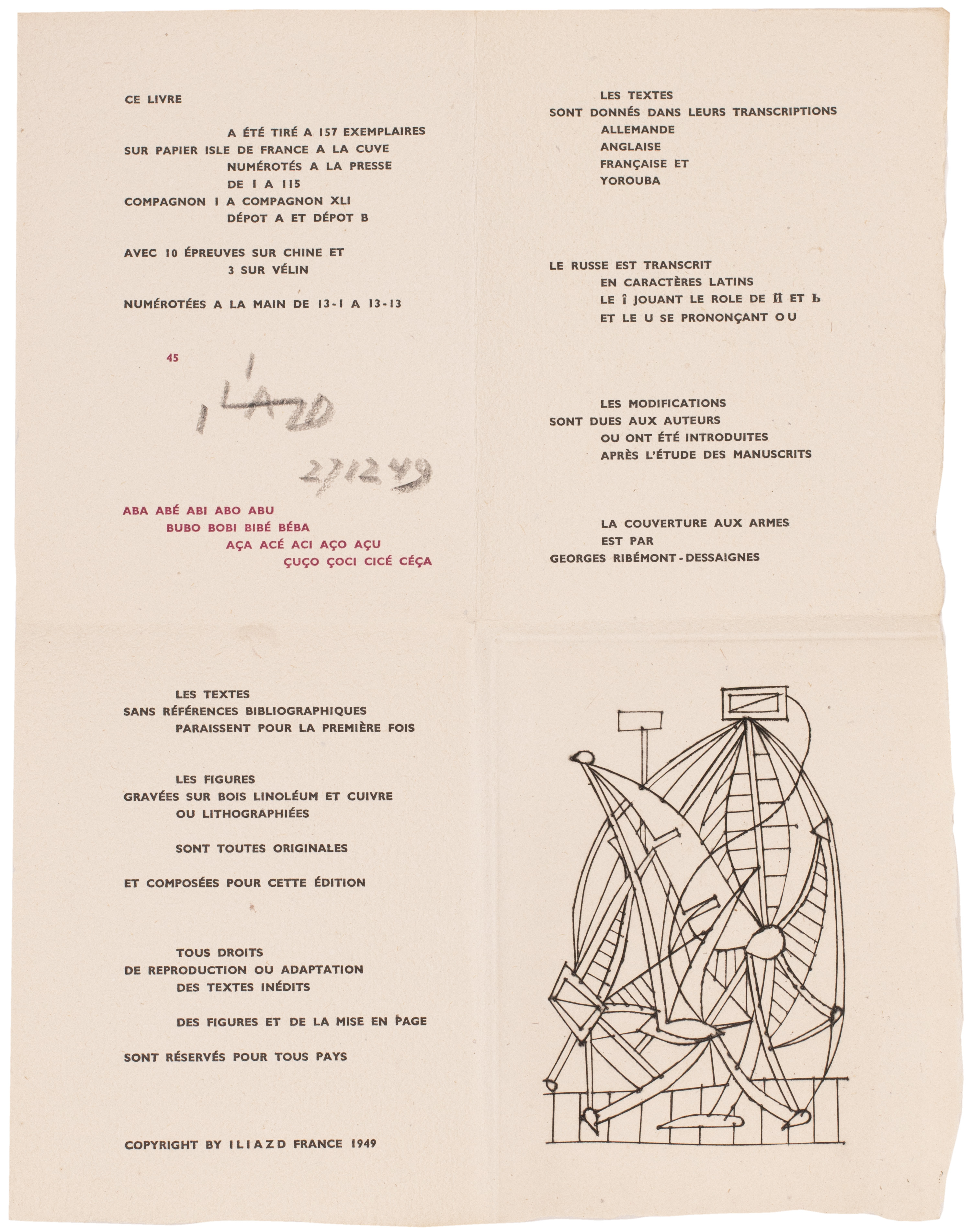 From the edition limited to 158 copies on papier Isle de France à la cuve, with this one of 115 numbered in Arabic numerals in red to the justification (i.e. leaf '3' with Dominguez' engraving) and signed and dated '271249' in black crayon by Iliazd; a further 41 'exemplaires de compagnon' numbered in Roman numerals and two 'dépot' copies all on the same paper and 13 proofs on vellum or chine were also issued.