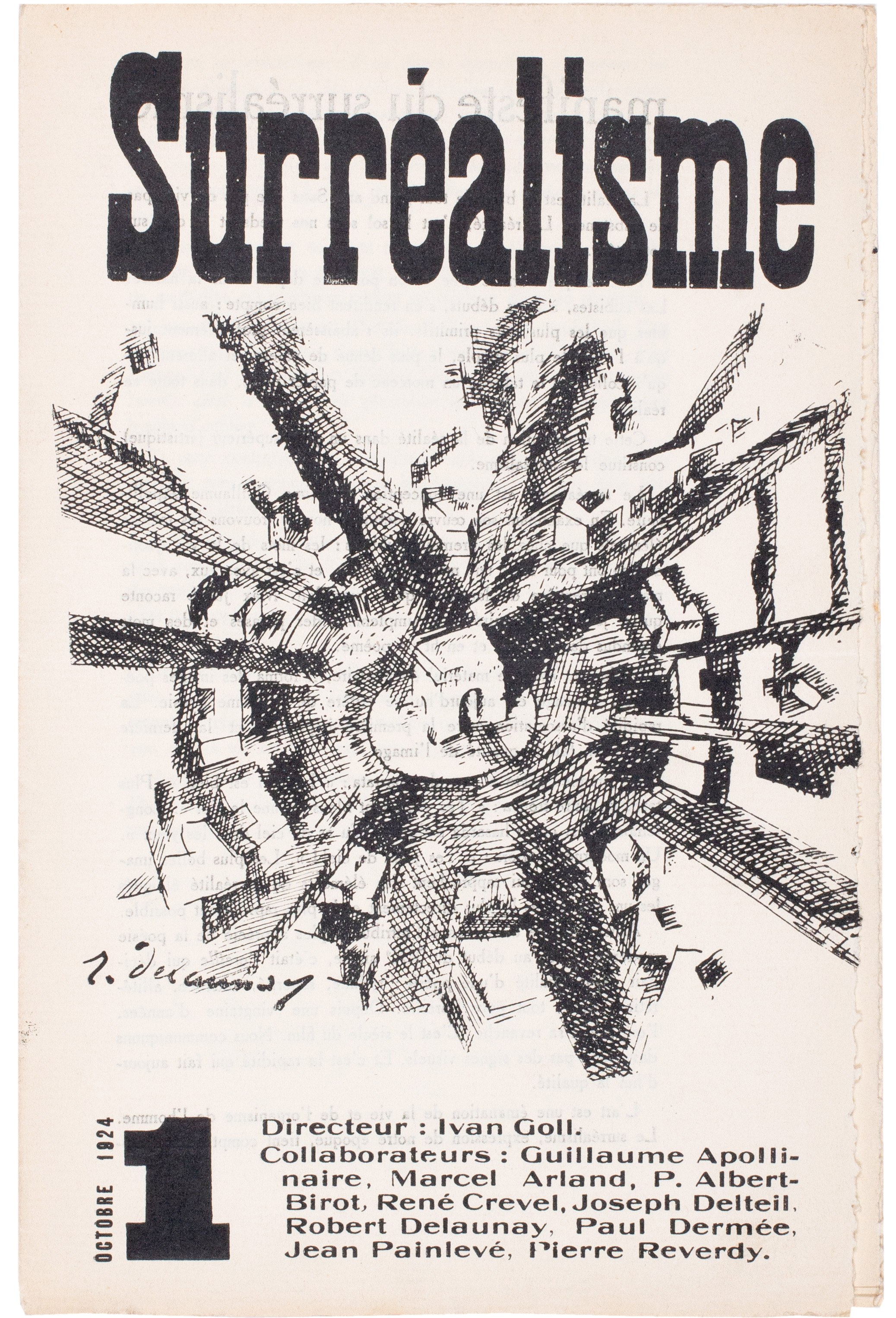 [4 bifolia: 8 unnumbered leaves including wrappers]. 4to. (252 x 166 mm). Leaf with title 'Surréalisme', monochrome illustration by Robert Delaunay, details of the Directeur and Collaborateurs (see below), verso and following recto with 'manifeste du surréalisme', printed text in French by various contributors throughout (see also below), final leaf verso (i.e. rear wrapper) with advertisements. Original printed paper wrappers stapled as issued.