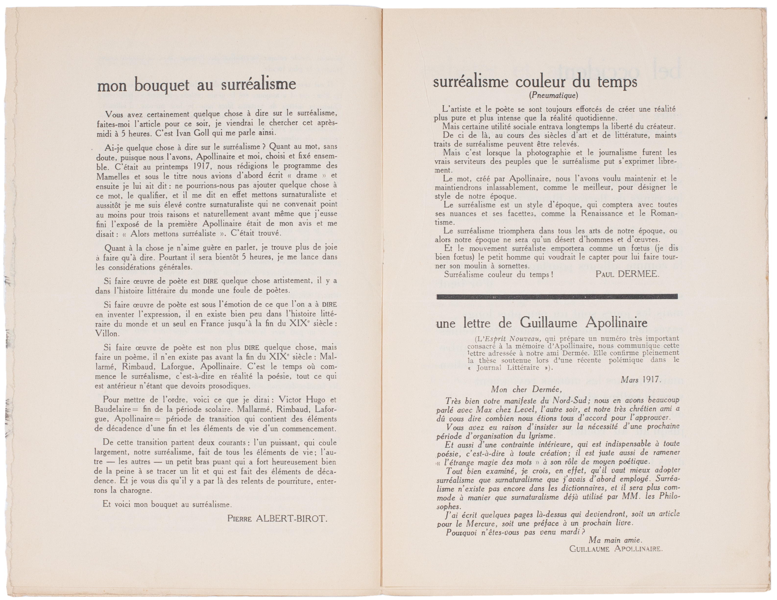 An excellent copy of the first Manifesto of Surrealism issued by the Apollinairean Surrealists in 1924 and preceding Breton's 'Manifeste de Surréalisme' by two weeks.