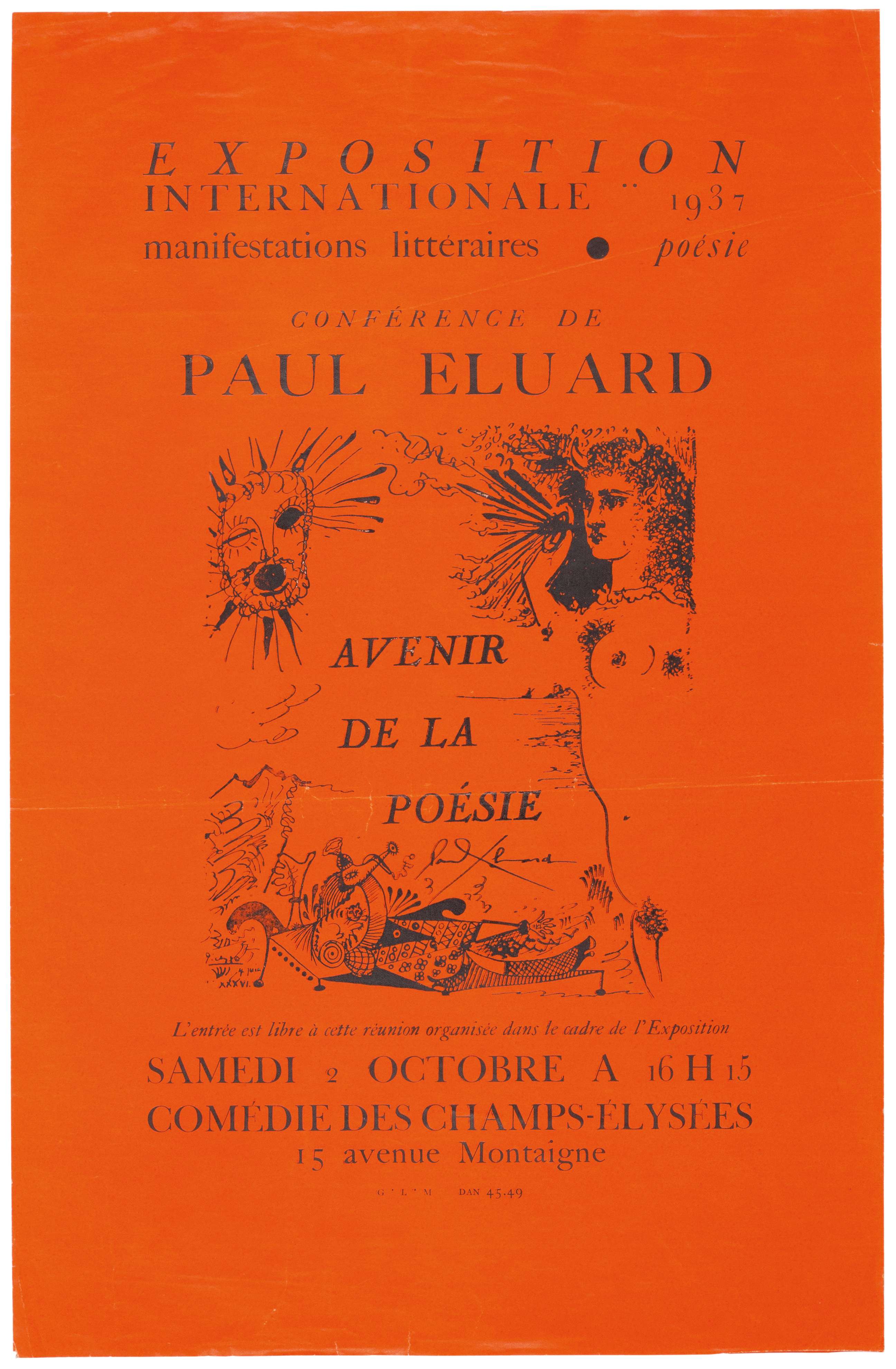 The very rare poster by Picasso together with the catalogue and the invitation - also with the same image by Picasso - for Paul Eluard's 1937 conference 'Avenir de la Poésie'.